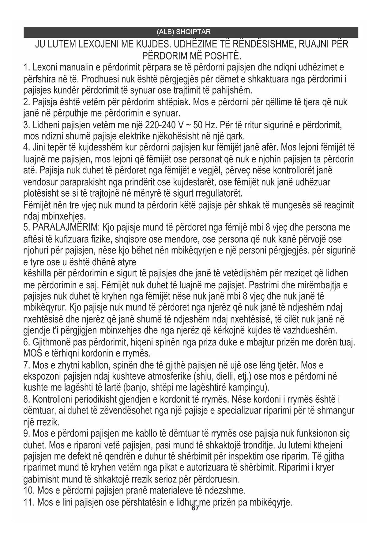 5. PARALAJMËRIM: Kjo pajisje mund të përdoret nga fëmijë mbi 8 vjeç dhe persona me