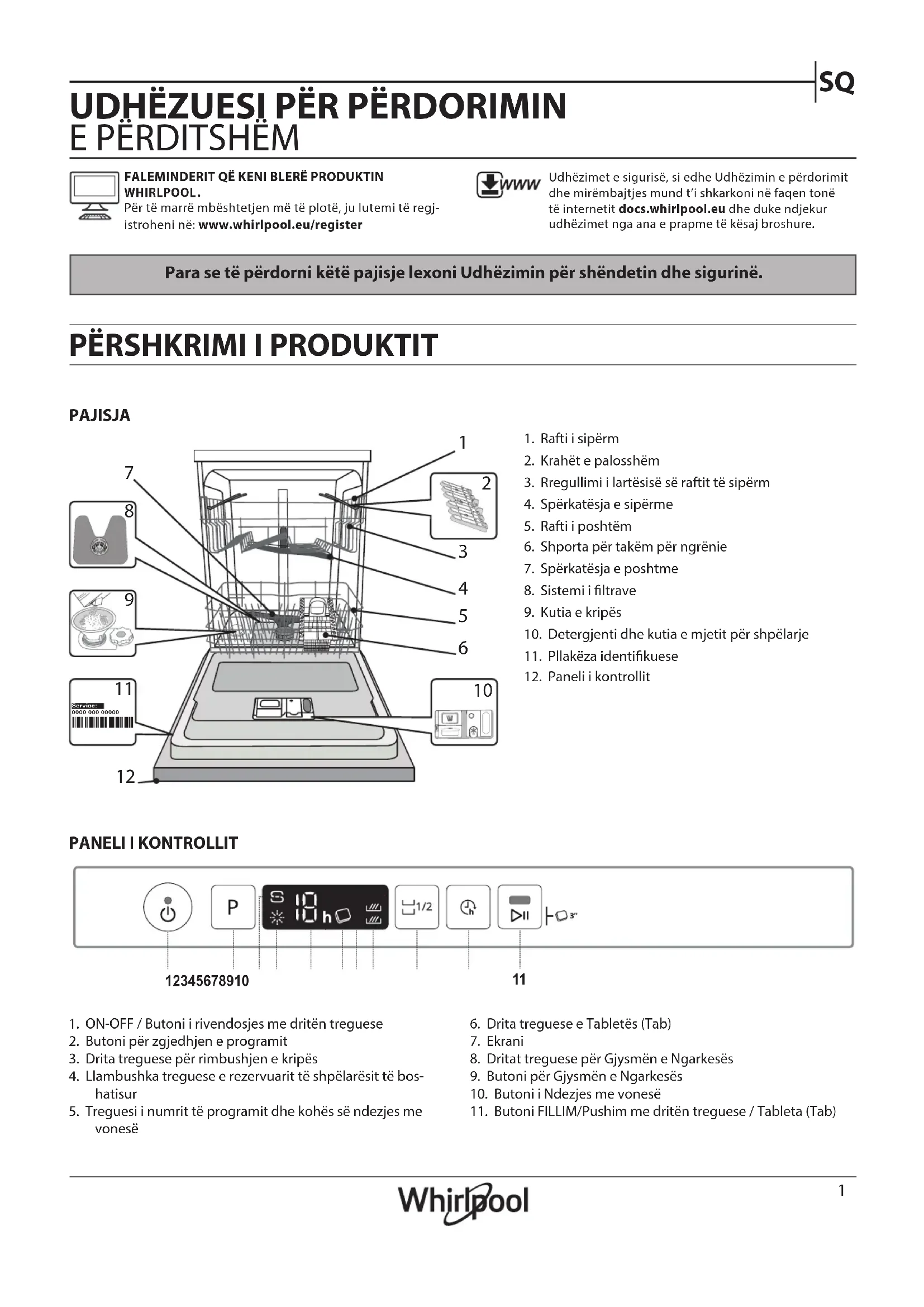 Për të marrë mbështetjen më të plotë, ju lutemi të regj-istroheni në: www.whirlpool.eu/registerUdhëzimet e sigurisë, si edhe Udhëzimin e përdorimit dhe mirëmbajtjes mund t’i shkarkoni në faqen tonë të internetit docs.whirlpool.eu dhe duke ndjekur udhëzimet nga ana e prapme të kësaj broshure.1. Rafti i sipërm2. Krahët e palosshëm3. Rregullimi i lartësisë së raftit të sipërm4. Spërkatësja e sipërme5. Rafti i poshtëm6. Shporta për takëm për ngrënie7. Spërkatësja e poshtme8. Sistemi i ltrave9. Kutia e kripës10. Detergjenti dhe kutia e mjetit për shpëlarje11. Pllakëza identikuese12. Paneli i kontrollit0000 000 00000 Service: