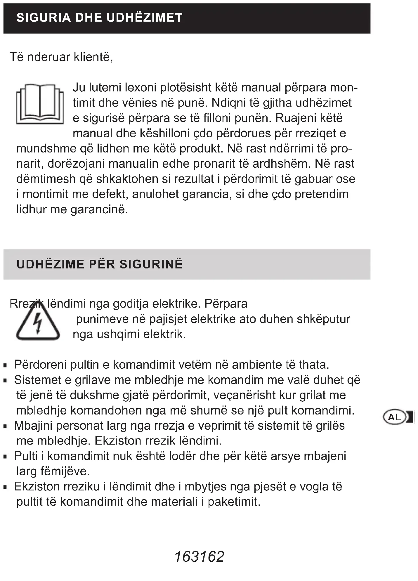 Të nderuar klientë, Ju lutemi lexoni plotësisht këtë manual përpara mon- timit dhe vënies në punë Ndiqni të gjitha udhëzimet e sigurisë përpara se të lloni punën. Ruajeni këtë manual dhe këshilloni çdo përdorues për rreziqet e mundshme që lidhen me këtë produkt Në rast ndërrimi të pro- narit, dorëzojani manualin edhe pronarit të ardhshëm Në rast dëmtimesh që shkaktohen si rezultat i përdorimit të gabuar ose i montimit me defekt, anulohet garancia, si dhe çdo pretendim lidhur me garancinë