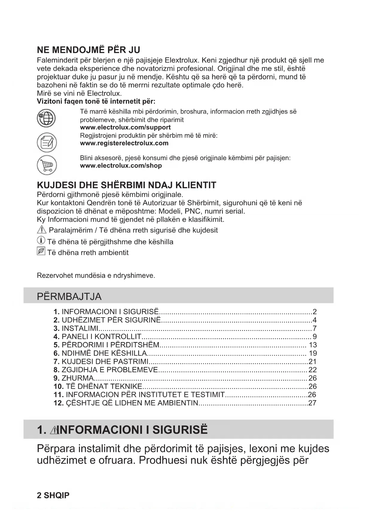 Përdorni gjithmonë pjesë këmbimi origjinale.Kur kontaktoni Qendrën tonë të Autorizuar të Shërbimit, sigurohuni që të keni nëdispozicion të dhënat e mëposhtme: Modeli, PNC, numri serial.Ky Informacioni mund të gjendet në pllakën e klasifikimit. Paralajmërim / Të dhëna rreth sigurisë dhe kujdesit Të dhëna të përgjithshme dhe këshilla Të dhëna rreth ambientitRezervohet mundësia e ndryshimeve. PËRMBAJTJA