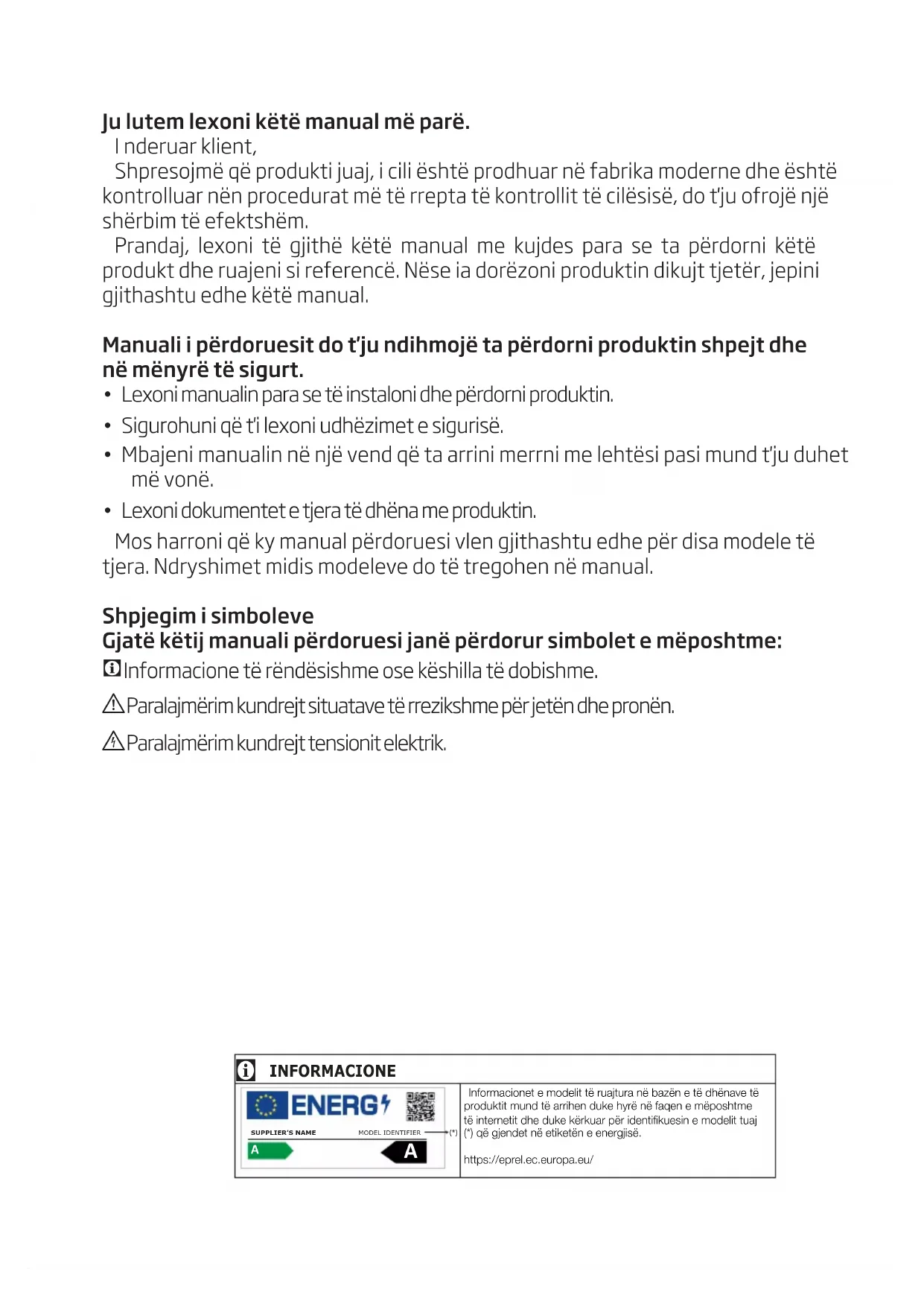 - Lexoni dokumentet e tjera të dhëna me produktin. Mos harroni që ky manual përdoruesi vlen gjithashtu edhe për disa modele të tjera. Ndryshimet midis modeleve do të tregohen në manual. Shpjegim i simboleve Gjatë këtij manuali përdoruesi janë përdorur simbolet e mëposhtme: CInformacione të rëndësishme ose këshilla të dobishme. AParalajmërim kundrejt situatave të rrezikshme për jetën dhe pronën. BParalajmërim kundrejt tensionit elektrik. INFORMACIONE