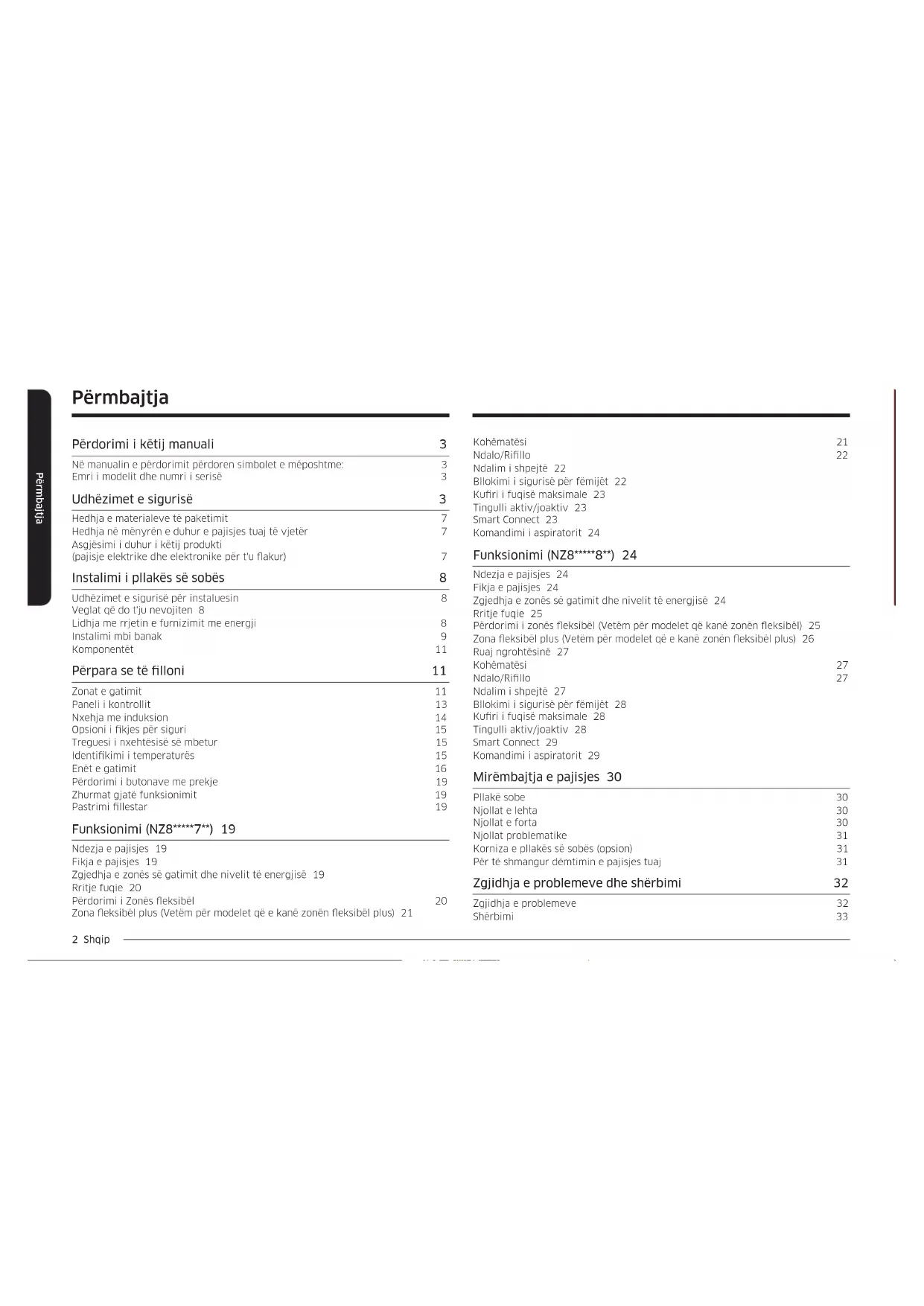 - (opłata według taryfy operatora) http://www.samsung.com/pl/ support/ LITHUANIA 8-800-77777 www.samsung.com/lt/support LATVIA 8000-7267 www.samsung.com/lv/support ESTONIA 800-7267 www.samsung.com/ee/supportPllakë sobe me induksion Manuali i përdorimit NZ84C5047** / NZ85C5047** / NZ84C6057** / NZ84C6058** / NZ85C6057** / NZ85C6058**2 Shqip Përmbajtja Përmbajtja Kohëmatësi 21 Ndalo/Rillo 22 Ndalim i shpejtë 22 Bllokimi i sigurisë për fëmijët 22 Kuri i fuqisë maksimale 23 Tingulli aktiv/joaktiv 23 Smart Connect 23 Komandimi i aspiratorit 24 Funksionimi (NZ8*****8**) 24 Ndezja e pajisjes 24 Fikja e pajisjes 24 Zgjedhja e zonës së gatimit dhe nivelit të energjisë 24 Rritje fuqie 25 Përdorimi i zonës eksibël (Vetëm për modelet që kanë zonën eksibël) 25 Zona eksibël plus (Vetëm për modelet që e kanë zonën eksibël plus) 26 Ruaj ngrohtësinë 27 Kohëmatësi 27 Ndalo/Rillo 27 Ndalim i shpejtë 27 Bllokimi i sigurisë për fëmijët 28 Kuri i fuqisë maksimale 28 Tingulli aktiv/joaktiv 28 Smart Connect 29 Komandimi i aspiratorit 29 Mirëmbajtja e pajisjes 30 Pllakë sobe 30 Njollat e lehta 30 Njollat e forta 30 Njollat problematike 31 Korniza e pllakës së sobës (opsion) 31 Për të shmangur dëmtimin e pajisjes tuaj 31 Zgjidhja e problemeve dhe shërbimi 32 Zgjidhja e problemeve 32 Shërbimi 33 Përmbajtja Përdorimi i këtij manuali 3 Në manualin e përdorimit përdoren simbolet e mëposhtme: 3 Emri i modelit dhe numri i serisë 3 Udhëzimet e sigurisë 3 Hedhja e materialeve të paketimit 7 Hedhja në mënyrën e duhur e pajisjes tuaj të vjetër 7 Asgjësimi i duhur i këtij produkti (pajisje elektrike dhe elektronike për t'u akur) 7 Instalimi i pllakës së sobës 8 Udhëzimet e sigurisë për instaluesin 8 Veglat që do t'ju nevojiten 8 Lidhja me rrjetin e furnizimit me energji 8 Instalimi mbi banak 9 Komponentët 11 Përpara se të lloni 11 Zonat e gatimit 11 Paneli i kontrollit 13 Nxehja me induksion 14 Opsioni i kjes për siguri 15 Treguesi i nxehtësisë së mbetur 15 Identikimi i temperaturës 15 Enët e gatimit 16 Përdorimi i butonave me prekje 19 Zhurmat gjatë funksionimit 19 Pastrimi llestar 19 Funksionimi (NZ8*****7**) 19 Ndezja e pajisjes 19 Fikja e pajisjes 19 Zgjedhja e zonës së gatimit dhe nivelit të energjisë 19 Rritje fuqie 20 Përdorimi i Zonës eksibël 20 Zona eksibël plus (Vetëm për modelet që e kanë zonën eksibël plus) 21Shqip 3 Përdorimi i këtij manuali Përdorimi i këtij manuali Ju lutemi, para se ta përdorni pajisjen, gjeni kohën për të lexuar këtë manual përdorimi, duke i kushtuar vëmendje të veçantë informacionit mbi sigurinë që gjendet në seksionin e mëposhtëm. Ruajeni këtë manual për t'iu referuar në të ardhmen. Në rast transferimi të pronësisë së pajisjes, ju lutemi mos harroni t'ia kaloni manualin zotëruesit të ri. Në manualin e përdorimit përdoren simbolet e mëposhtme: VINI RE Rreziqe ose praktika jo të sigurta që mund të rezultojnë në lëndim të rëndë të personit ose vdekje. KUJDES Rreziqe ose praktika jo të sigurta që mund të rezultojnë në lëndim të lehtë të personit ose dëmtim të pronës. KUJDES Për të zvogëluar rrezikun e zjarrit, shpërthimit, goditjes elektrike ose dëmtimit personal kur përdorni pllakën e sobës, ndiqni këto paralajmërime bazë të sigurisë. SHËNIM Këshilla, rekomandime ose informacione të dobishme që ndihmojnë përdoruesit për përdorimin e produktit. Emri i modelit dhe numri i serisë Emri i modelit dhe numri i serisë kanë etiketë poshtë bazamentit të pllakës së sobës. Për përdorim të mëvonshëm, shkruajeni informacionin ose ngjiteni etiketën shtesë të produktit (që ndodhet në krye të produktit) në faqen aktuale. Emri i modelit Numri i serisë Udhëzimet e sigurisë Aspektet e sigurisë së kësaj pajisjeje përputhen me të gjitha standardet e pranuara teknike dhe të sigurisë. Megjithatë, si prodhues ne gjithashtu besojmë se është përgjegjësi e jona që t'ju njohim me udhëzimet e mëposhtme të sigurisë. VINI RE Pajisja nuk është parashikuar për përdorim nga persona (duke përfshirë fëmijët) me aftësi të kuzuara zike, ndijore ose mendore, ose me mungesë përvoje dhe njohurish, nëse ata nuk mbikëqyren ose udhëzohen në lidhje me përdorimin e pajisjes nga një person përgjegjës për sigurinë e tyre. Fëmijët duhet të mbikëqyren për t'u siguruar që të mos luajnë me pajisjen. Kjo pajisje mund të përdoret nga fëmijë të moshës 8 vjeç e lart dhe nga persona me aftësi ndijore, zike dhe mendore të reduktuara, ose me mungesë përvoje dhe njohurish, nëse janë nën mbikëqyrje ose udhëzohen për përdorimin në mënyrë të sigurt të pajisjes dhe që kuptojnë rreziqet e përfshira. Fëmijët nuk duhet të luajnë me pajisjen. Pastrimi dhe mirëmbajtja nga përdoruesi nuk do të kryhet nga fëmijët pa mbikëqyrje. Mënyra e shkëputjes duhet të përcaktohet mbi kabllot kse sipas rregullave të instalimit të kabllove.4 Shqip Udhëzimet e sigurisë Udhëzimet e sigurisë Pajisja nuk është parashikuar të përdoret nëpërmjet një kohëmatësi të jashtëm ose nëpërmjet një sistemi të veçantë komandimi në distancë. KUJDES: Procesi i gatimit duhet mbikëqyrur. Proceset afatshkurtra të gatimit duhen mbikëqyrur vazhdimisht. Pajisja nuk duhet instaluar pas një dere dekorative, për të evituar mbinxehjen. VINI RE: Pajisja dhe pjesët e saj të jashtme nxehen gjatë përdorimit. Duhet të bëni kujdes të shmangni prekjen e elementeve të ngrohjes. Fëmijët nën 8 vjeç duhet të mbahen larg, përveç rasteve kur janë nën mbikëqyrje të vazhdueshme. VINI RE: Gatimi i pambikëqyrur mbi pllakë me vaj apo yndyra mund të jetë i rrezikshëm dhe të shkaktojë zjarr. KURRË mos u përpiqni të shuani zjarrin me ujë, por keni pajisjen dhe mbuloni akët p.sh. me ndonjë kapak apo batanije kundër zjarrit. VINI RE: Rrezik zjarri: Mos vendosni sende mbi si