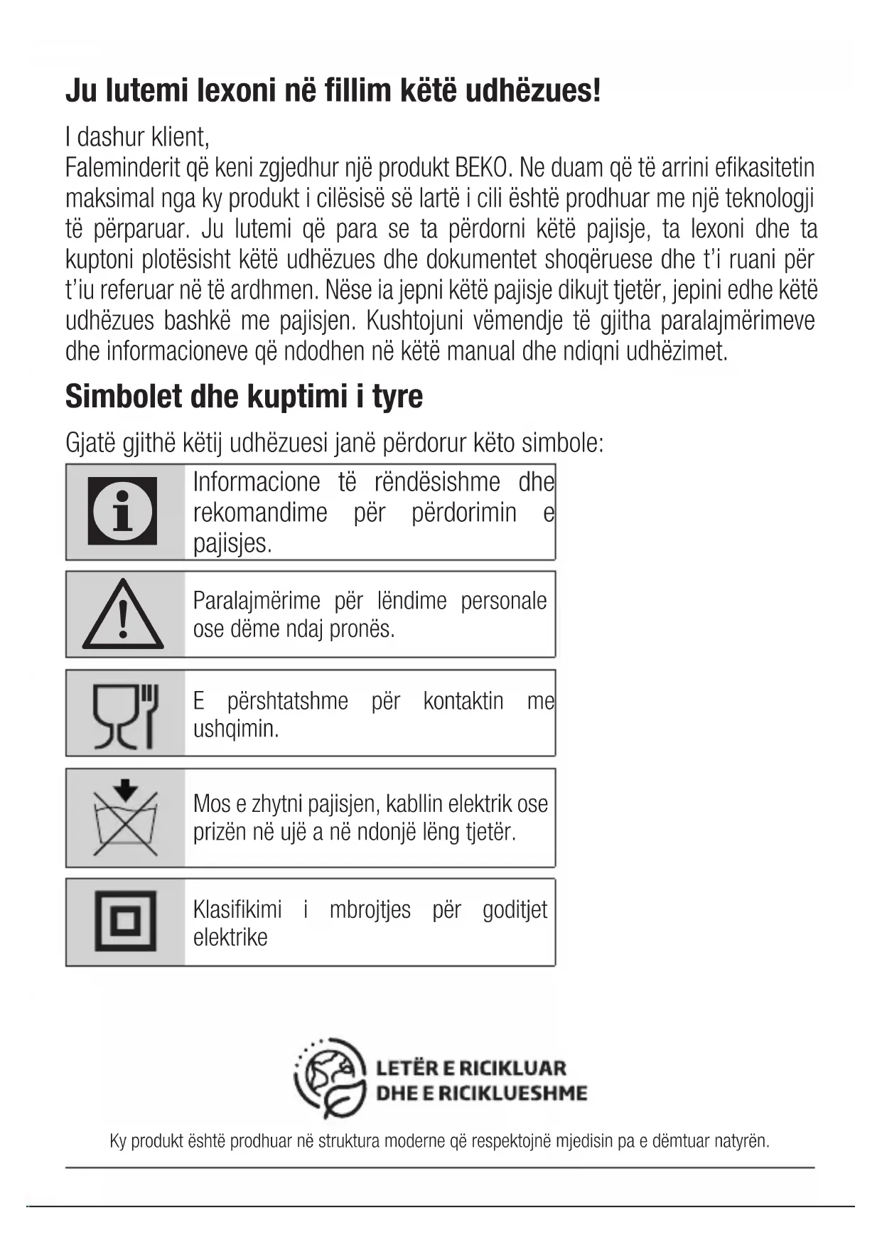 - Ako uređaj padne, uređaj možda neće raditi ili može doći do trajnih oštećenja.Ju lutemi lexoni në fillim këtë udhëzues! I dashur klient, Faleminderit që keni zgjedhur një produkt BEKO. Ne duam që të arrini efikasitetin maksimal nga ky produkt i cilësisë së lartë i cili është prodhuar me një teknologji të përparuar. Ju lutemi që para se ta përdorni këtë pajisje, ta lexoni dhe ta kuptoni plotësisht këtë udhëzues dhe dokumentet shoqëruese dhe t’i ruani për t’iu referuar në të ardhmen. Nëse ia jepni këtë pajisje dikujt tjetër, jepini edhe këtë udhëzues bashkë me pajisjen. Kushtojuni vëmendje të gjitha paralajmërimeve dhe informacioneve që ndodhen në këtë manual dhe ndiqni udhëzimet. Simbolet dhe kuptimi i tyre Gjatë gjithë këtij udhëzuesi janë përdorur këto simbole: