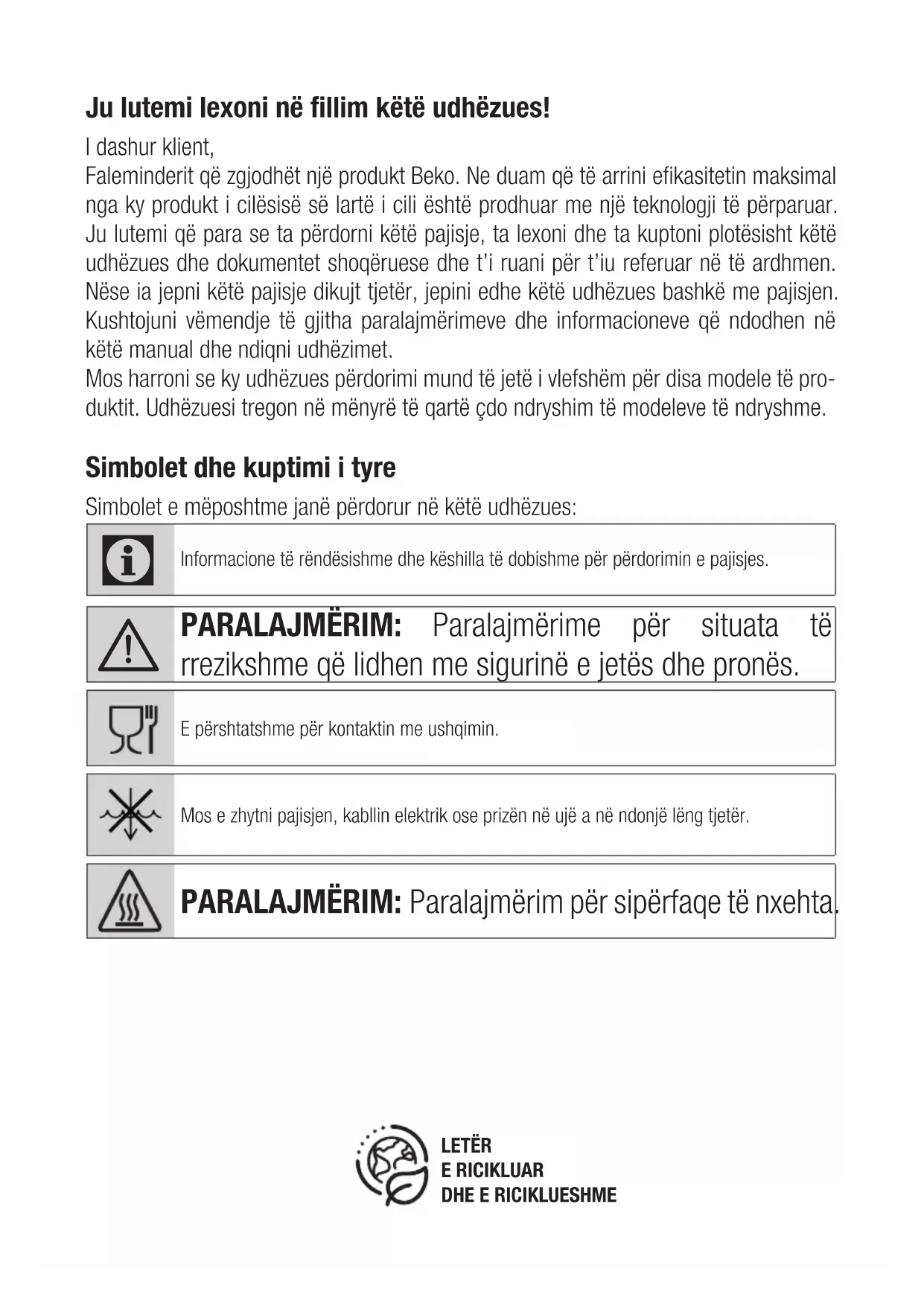 - Nëse kordoni elektrik është i dëmtuar, ai duhet të zëvendëso- het nga prodhuesi, agjenti i shërbimit ose persona të ng- jashëm të kualifikuar për të sh- mangur rreziqet e mundshme. 1 Udhëzime të rëndësishme për sigurinë dhe mjedisin