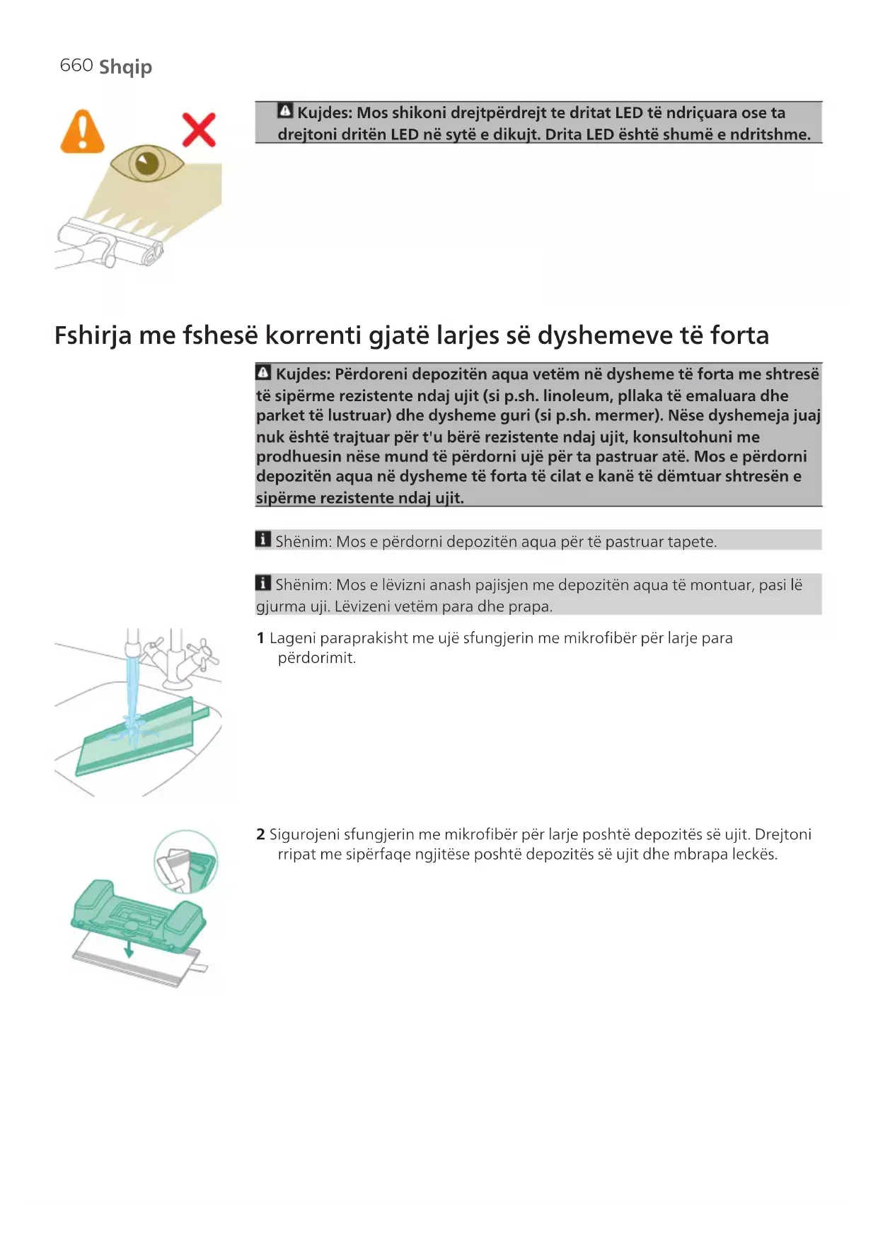 3 Pajisja është projektuar që të arrij nivelin e plotë të karikimit brenda 6 orëve. Ju mund të monitoroni progresin e karikimit në ekran. Kur pajisja është karikuar plotësisht, vlera 100% ndizet në ekran. Pas disa minutave, ekrani do të fiket. Përdorimi i pajisjes Montimi i pajisjes 1 Bashkojeni fshesën e dorës me tubin. Konfirmoni bashkimin e kokës përmes një tingulli "klik". 2 Bashkoni tubin me grykëzën. Konfirmoni bashkimin e kokës përmes një tingulli "klik".659 Shqip Fshirja me fshesë korrenti e dyshemeve të buta dhe të forta 1 Shtypni butonin e ndezjes/fikjes për të ndezur pajisjen. Shënim: Për ta fikur pajisjen, shtypni sërish butonin e ndezjes/fikjes. 2 Përdorni butonat + dhe - për të ndërruar midis tri cilësimeve të ndryshme të fuqisë: E - modaliteti eco N - modaliteti normal T - modaliteti "turbo" 3 Me fshesën me korrent ju mund të pastroni dysheme të forta ose të buta. Me njohjen e llojit të dyshemesë aktiv, pajisja njeh llojin e dyshemesë dhe optimizon automatikisht performancën në cilësimet e fuqisë që keni zgjedhur. Për ta çaktivizuar këtë veçori, kontrolloni si të personalizoni cilësimet më poshtë. Paralajmërim: Mos pastroni me fshesë me korrent ujë ose lëngje të tjera.660 Shqip Kujdes: Mos shikoni drejtpërdrejt te dritat LED të ndriçuara ose ta drejtoni dritën LED në sytë e dikujt. Drita LED është shumë e ndritshme. Fshirja me fshesë korrenti gjatë larjes së dyshemeve të forta Kujdes: Përdoreni depozitën aqua vetëm në dysheme të forta me shtresë të sipërme rezistente ndaj ujit (si p.sh. linoleum, pllaka të emaluara dhe parket të lustruar) dhe dysheme guri (si p.sh. mermer). Nëse dyshemeja juaj nuk është trajtuar për t'u bërë rezistente ndaj ujit, konsultohuni me prodhuesin nëse mund të përdorni ujë për ta pastruar atë. Mos e përdorni depozitën aqua në dysheme të forta të cilat e kanë të dëmtuar shtresën e sipërme rezistente ndaj ujit. Shënim: Mos e përdorni depozitën aqua për të pastruar tapete. Shënim: Mos e lëvizni anash pajisjen me depozitën aqua të montuar, pasi lë gjurma uji. Lëvizeni vetëm para dhe prapa. 1 Lageni paraprakisht me ujë sfungjerin me mikrofibër për larje para përdorimit. 2 Sigurojeni sfungjerin me mikrofibër për larje poshtë depozitës së ujit. Drejtoni rripat me sipërfaqe ngjitëse poshtë depozitës së ujit dhe mbrapa leckës.661 Shqip MAX 50 °C 3 Mbushni depozitën me ujë, duke u siguruar që temperatura e ujit të mos tejkalojë 50°C. 10 ml 4 (Opsionale) Nëse dëshironi të shtoni një solucion të lëngshëm pastrimi në depozitën e ujit, zgjidhni një lloj me pak shkumë ose pa shkumë që mund të tretet. Ne rekomandojmë pastruesin për dysheme Philips XV1792. Shtoni vetëm disa pika të solucionit të lëngshëm të pastrimit në ujë. 5 Mbylleni depozitën e ujit siç duhet. 6 Bashkoni depozitën e përgatitur të ujit me grykëzën e ujit dhe jeni gati për të filluar. Sigurohuni që drejtimi i depozitës së ujit të jetë i saktë. 7 Shtypni butonin e ndezjes/fikjes për të ndezur pajisjen. Me modulin e ujit të lidhur me grykëzën mund të pastroni në mënyrë efikase dyshemetë e forta.662 Shqip Shënim: Moduli i ujit nuk është i përshtatshëm për dysheme të buta si ato me tapet. Shënim: Mos e përdorni grykëzën e ujit pa depozitën e ujit të vendosur për të pastruar. Kujdes: Moduli i ujit nuk duhet të përdoret për të thithur piklat e ujit. Këshilla dhe informacione të tjera të rëndësishme