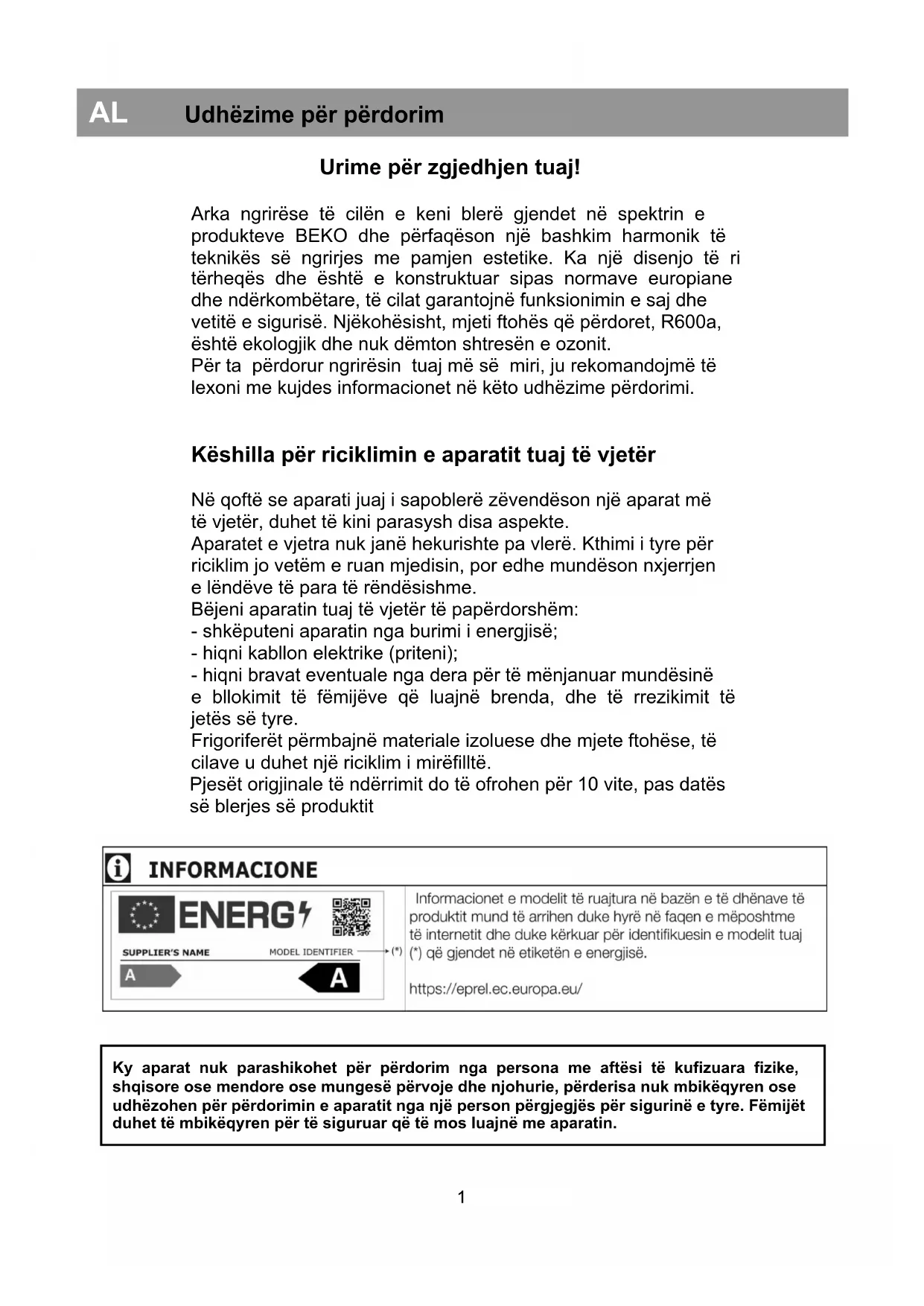 AL Udhëzime për përdorim Ky aparat nuk parashikohet për përdorim nga persona me aftësi të kufizuara fizike, shqisore ose mendore ose mungesë përvoje dhe njohurie, përderisa nuk mbikëqyren ose udhëzohen për përdorimin e aparatit nga një person përgjegjës për sigurinë e tyre. Fëmijët duhet të mbikëqyren për të siguruar që të mos luajnë me aparatin.Riciklimi i ambalazhit KUJ DES ! Mos lejoni që fëmijë të luajnë me ambalazhin ose me pjesë të tij. Ekziston rreziku i asfiksisë me pjesë të kartonit të valëzuar dhe me fletën e plastikut. Për të arritur te ju në gjendje të mirë, aparati u mbrojt me një ambalazh të përshtatshëm. Të gjitha materialet e ambalazhit janë të pajtueshme me mjedisin dhe të riciklueshme. Ju lutem na ndihmoni për ta ricikluar ambalazhin duke e mbrojtur mjedisin! E RENDESISHME! Para se ta vini aparatin në përdorim, lexojini këto udhëzime me kujdes dhe në tërësi. Përmbajnë informacione të rëndësishme për ngritjen, përdorimin dhe mirëmbajtjen e aparatit. Prodhuesi është i lirë nga çfarëdo përgjegjësie në qoftë se informacionet në këtë dokument nuk respektohen. Ruajini udhëzimet në një vend të sigurtë për t'i arritur lehtë në rast nevoje. Gjithashtu mund të jenë të dobishme më pas për një përdorues tjetër. KUJ DES ! Ky aparat duhet të përdoret vetëm për qëllimin e tij të parashikuar (përdorim shtëpiak) në zona të përshtatshme, larg shiut, lagështisë ose kushteve të tjera të motit. Udhëzime transporti Aparati duhet të transportohet sipas mundësisë vetëm në pozitën vertikale. Ambalazhi duhet të jetë në gjendje perfekte gjatë transportit. Në qoftë se gjatë transportit aparati u vendos në pozitën horizontale (vetëm sipas shënimeve mbi ambalazhin), rekomandohet që para vënies në përdorim, aparati të lihet për 4 orë, kështu që qarku ftohës të stabilizohet. Mosrespektimi i këtyre udhëzimeve mund të shkaktojë avarinë e motorkompresorit dhe anulimin e garancisë së tij. Paralajmërime dhe këshilla të veçanta Mos e lidhni aparatin me korrent nëse keni vënë re një defekt. Riparimet duhet të bëhen vetëm nga personel i kualifikuar. Në situatat vijuese ju lutem hiqeni aparatin nga rrjeti: - kur shkrini plotësisht akullin e aparatit; - kur e pastroni aparatin. Për ta hequr aparatin nga priza, tërhiqeni fishën, jo kabllon! Siguroni hapësirën minimale midis aparatit dhe murit kundër të cilit është vendosur. Mos u ngjitni mbi aparatin. Mos lejoni që fëmijë të luajnë ose fshihen brenda aparatit. Mos përdorni kurrë aparate elektrike brenda ngrirësit për heqjen e akullit. Mos e përdorni aparatin pranë aparateve nxehëse, sobave ose burimeve të tjera nxehtësie dhe zjarri. Mos lini derën e ngrirësit të hapur më shumë sesa nevojitet për ta vënë ose nxjerrë ushqimin. Mos e lini ushqimin në aparat në qoftë se ai nuk punon. Mos mbani brenda produkte që përmbajnë gazra të ndezshme ose të shpërthyeshme. Mos mbani pije shkumëzuese (lëng, ujë mineral, shampanjë etj.) në ngrirës: shishja mund të shpërthehet! Mos ngrini pije në shishe plastiku. Mos hani kube akulli ose akullore menjëherë pas nxjerrjes nga ngrirësi sepse mund të shkaktojnë "ndezje ngrirësi".