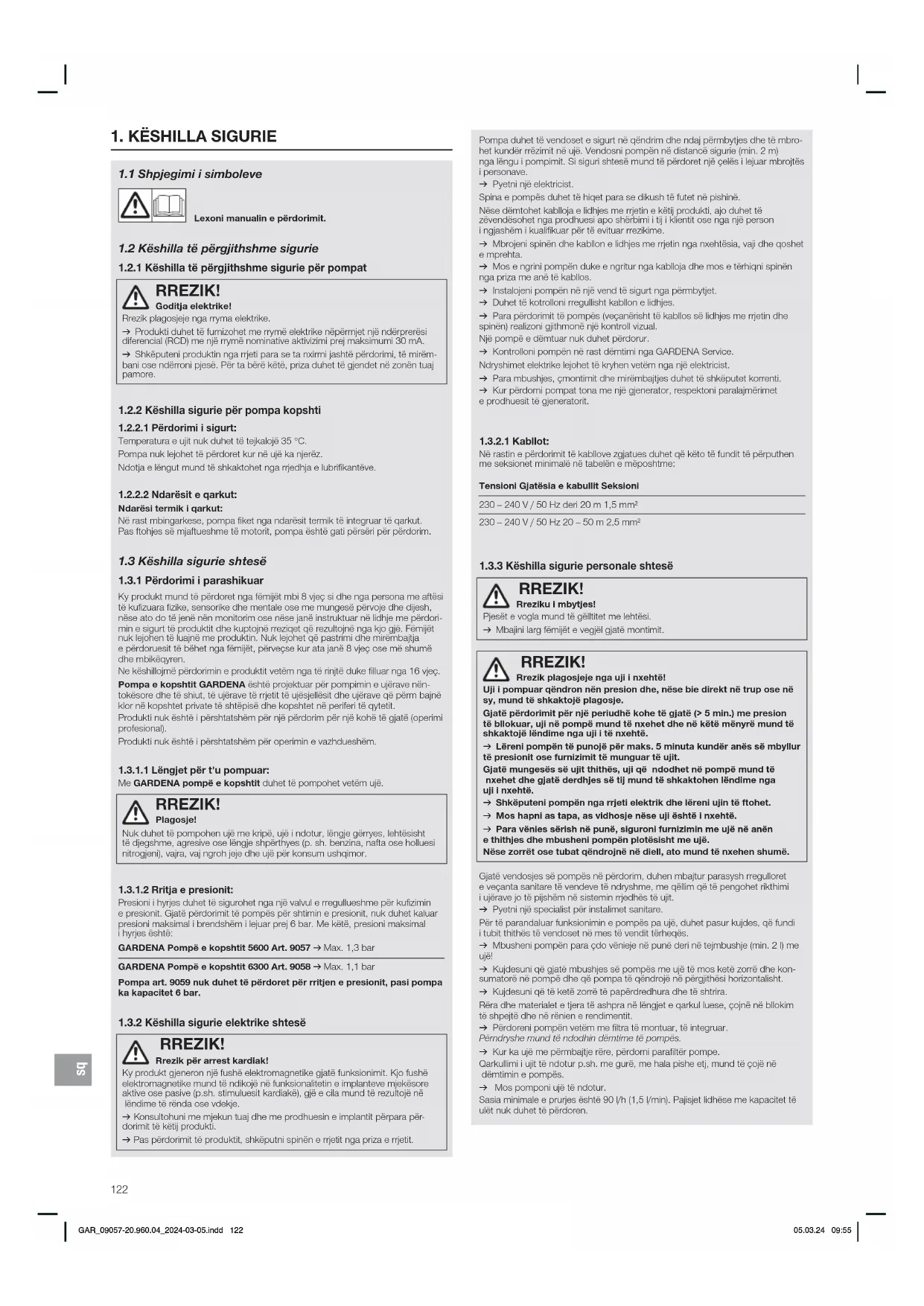 RREZIK! Rrezik për arrest kardiak!Ky produkt gjeneron një fushë elektromagnetike gjatë funksionimit. Kjo fushë elektromagnetike mund të ndikojë në funksionalitetin e implanteve mjekësore aktive ose pasive (p.sh. stimuluesit kardiakë), gjë e cila mund të rezultojë në lëndime të rënda ose vdekje. v Konsultohuni me mjekun tuaj dhe me prodhuesin e implantit përpara për- dorimit të këtij produkti. v Pas përdorimit të produktit, shkëputni spinën e rrjetit nga priza e rrjetit. Pompa duhet të vendoset e sigurt në qëndrim dhe ndaj përmbytjes dhe të mbro-het kundër rrëzimit në ujë. Vendosni pompën në distancë sigurie (min. 2m) nga lëngu i pompimit. Si siguri shtesë mund të përdoret një çelës i lejuar mbrojtës i personave.v Pyetni një elektricist.Spina e pompës duhet të hiqet para se dikush të futet në pishinë.Nëse dëmtohet kablloja e lidhjes me rrjetin e këtij produkti, ajo duhet të zëvendësohet nga prodhuesi apo shërbimi i tij i klientit ose nga një person i ngjashëm i kualifikuar për të evituar rrezikime.v Mbrojeni spinën dhe kabllon e lidhjes me rrjetin nga nxehtësia, vaji dhe qoshet e mprehta.v Mos e ngrini pompën duke e ngritur nga kablloja dhe mos e tërhiqni spinën nga priza me anë të kabllos.v Instalojeni pompën në një vend të sigurt nga përmbytjet.v Duhet të kotrolloni rregullisht kabllon e lidhjes.v Para përdorimit të pompës (veçanërisht të kabllos së lidhjes me rrjetin dhe spinën) realizoni gjithmonë një kontroll vizual.Një pompë e dëmtuar nuk duhet përdorur.v Kontrolloni pompën në rast dëmtimi nga GARDENA Service.Ndryshimet elektrike lejohet të kryhen vetëm nga një elektricist.v Para mbushjes, çmontimit dhe mirëmbajtjes duhet të shkëputet korrenti.v Kur përdorni pompat tona me një gjenerator, respektoni paralajmërimet e prodhuesit të gjeneratorit.