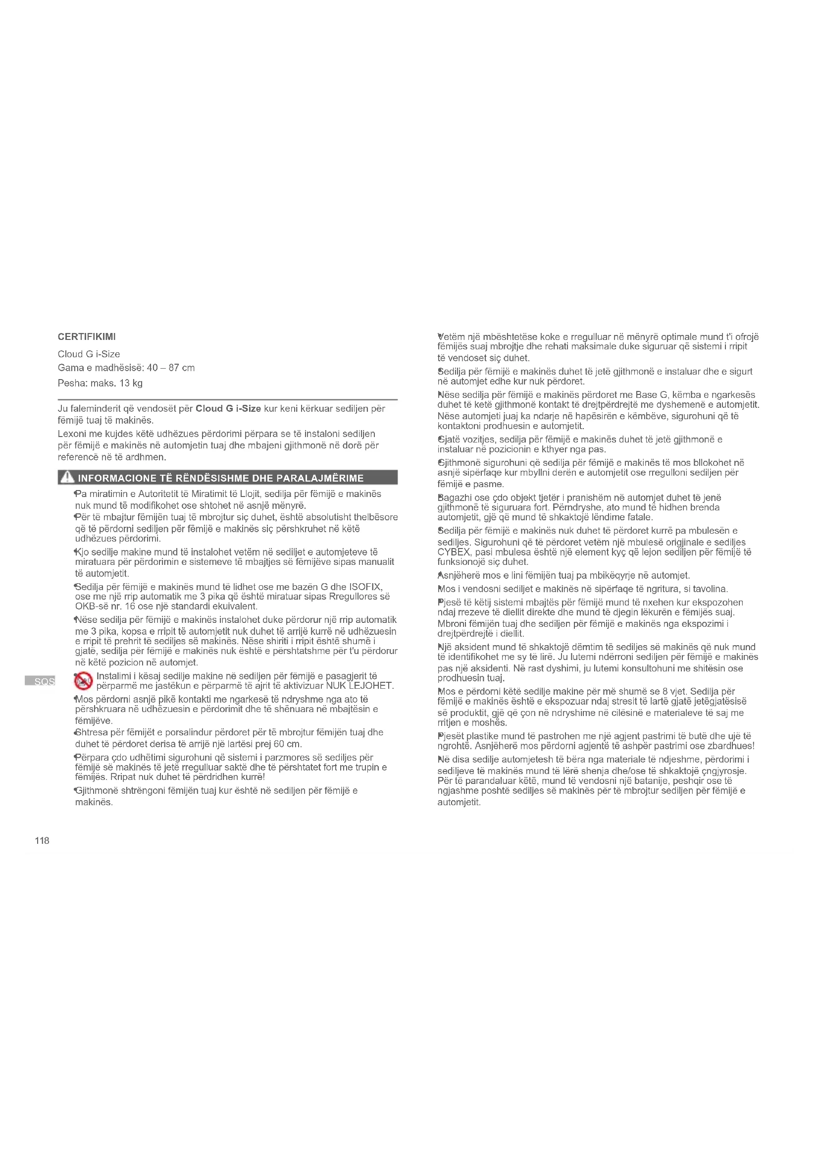 Ky është një Sistem i Përmirësuar i Mbajtjes së Fëmijëve i-Size. Kjo sedilje është miratuar sipas Rregullores së OKB-së Nr. R129/03, për përdorim në pozicionet e sediljeve të përputhshme me i-Size siç tregohet nga prodhuesit e automjeteve në manualet e tyre të përdorimit të automjeteve. Nëse automjeti juaj nuk ka një pozicion ndenjëse i-Size, ju lutemi kontrolloni Listën e Llojeve të automjetit. Mund të merrni versionin më të përditësuar të Listës së Llojeve nga go.cybex-online.com/cloud-g-isize-car-compatibility. Përndryshe, sedilja për fëmijë e makinës mund të instalohet në sediljet e automjetit me pamje përpara të pajisura me një sistem rripi automatik me 3 pika. Nuk është e garantuar që të gjitha pozicionet e ulura dhe të shtrira mund të përdoren në të gjitha automjetet e miratuara.