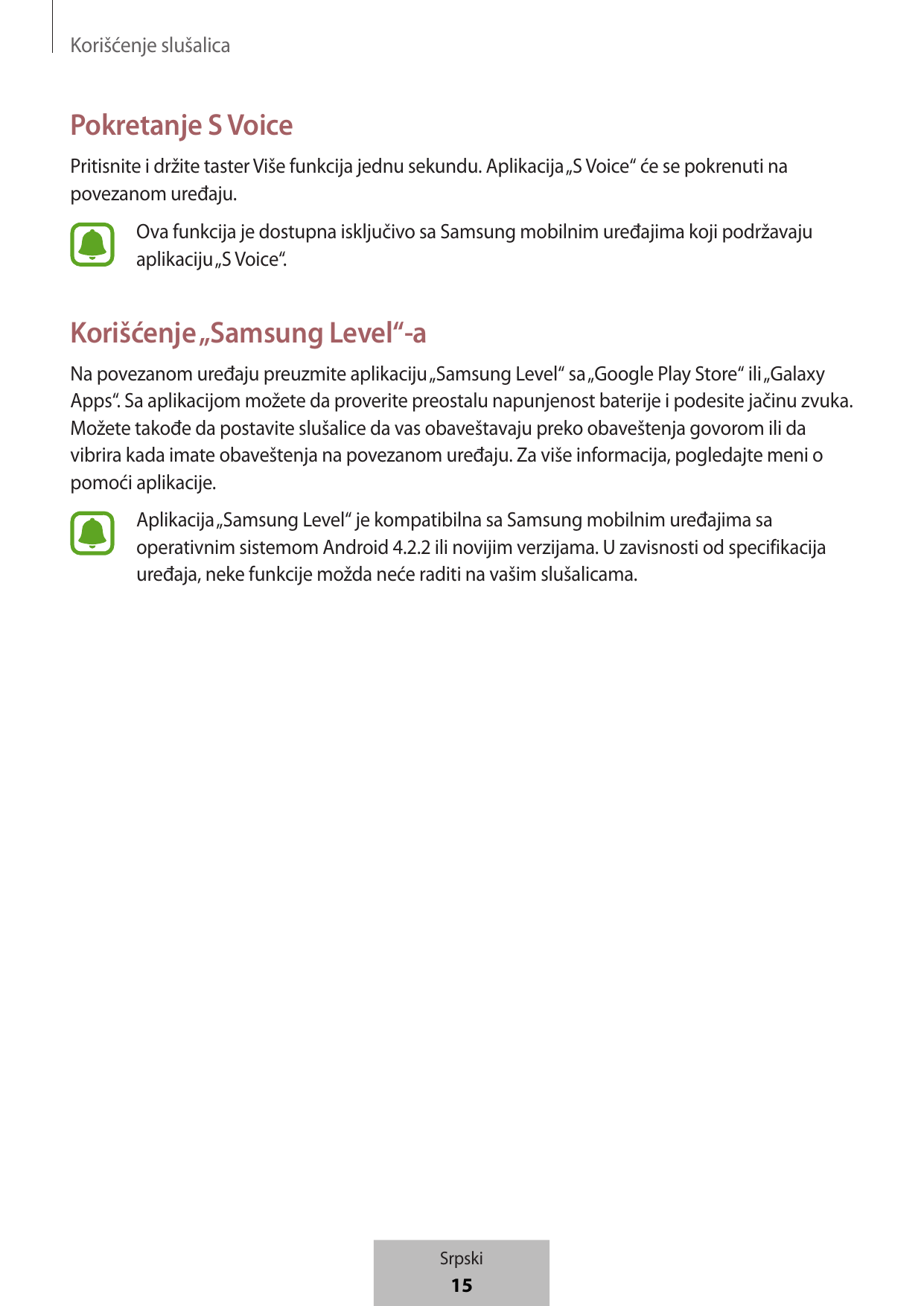 Korišćenje slušalica Pokretanje S Voice Pritisnite i držite taster Više funkcija jednu sekundu. Aplikacija „S Voice“ će se pokrenuti na povezanom uređaju. Ova funkcija je dostupna isključivo sa Samsung mobilnim uređajima koji podržavaju aplikaciju „S Voice“. Korišćenje „Samsung Level“-a Na povezanom uređaju preuzmite aplikaciju „Samsung Level“ sa „Google Play Store“ ili „Galaxy Apps“. Sa aplikacijom možete da proverite preostalu napunjenost baterije i podesite jačinu zvuka. Možete takođe da postavite slušalice da vas obaveštavaju preko obaveštenja govorom ili da vibrira kada imate obaveštenja na povezanom uređaju. Za više informacija, pogledajte meni o pomoći aplikacije. Aplikacija „Samsung Level“ je kompatibilna sa Samsung mobilnim uređajima sa operativnim sistemom Android 4.2.2 ili novijim verzijama. U zavisnosti od specifikacija uređaja, neke funkcije možda neće raditi na vašim slušalicama. Srpski