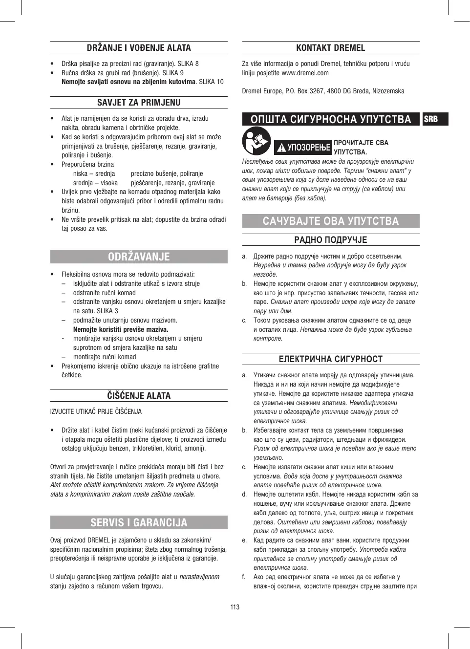 СЕРВИС И ГАРАНЦИЈА Овај DREMEL производ поседује гаранцију у складу са одредбама прописаним законом/специфичним за земљу; оштећења услед нормалног коришћења и трошења, преоптерећења или непрописно коришћење искључени су из оквира гаранције.