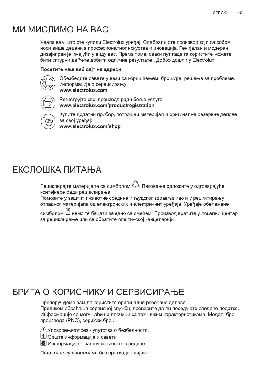 МИ МИСЛИМО НА ВАС Хвала вам што сте купили Electrolux уређај. Одабрали сте производ који са собом носи више деценија професионалног искуства и иновација. Генијалан и модеран, дизајниран је имајући у виду вас. Према томе, сваки пут када га користите можете бити сигурни да ћете добити одличне резултате . Добро дошли у Electrolux. Посетите наш веб сајт на адреси: Обезбедите савете у вези са коришћењем, брошуре, решења за проблеме, информације о сервисирању: www.electrolux.com Региструјте свој производ ради боље услуге: www.electrolux.com/productregistration Купите додатни прибор, потрошни материјал и оригиналне резервне делове за свој уређај: www.electrolux.com/shop ЕКОЛОШКА ПИТАЊА Рециклирајте материјале са симболом . Паковање одложите у одговарајуће контејнере ради рециклирања. Помозите у заштити животне средине и људског здравља као и у рециклирању отпадног материјала од електронских и електричних уређаја. Уређаје обележене немојте бацати заједно са смећем. Производ вратите у локални центар за рециклирање или се обратите општинској канцеларији. БРИГА О КОРИСНИКУ И СЕРВИСИРАЊЕ Препоручујемо вам да користите оригиналне резервне делове. Приликом обраћања сервисној служби, проверите да ли поседујете следеће податке. Информације се могу наћи на плочици са техничким карактеристикама. Модел, број производа (PNC), серијски број. Упозорење/опрез - упутства о безбедности. Опште информације и савети Информације о заштити животне средине. Подложне су променама без претходне најаве.