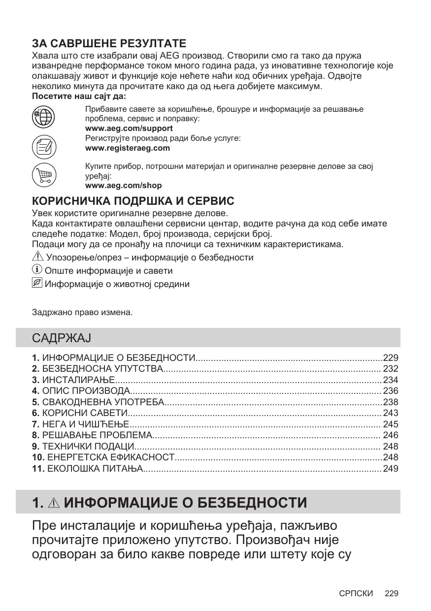 вместе с бытовыми отходами бытовую технику, помеченную символом . Прибор следует доставить в место раздельного накопления и сбора отходов потребления или в пункт сбора использованной бытовой техники для последующей утилизации. ЗА САВРШЕНЕ РЕЗУЛТАТЕ Хвала што сте изабрали овај AEG производ. Створили смо га тако да пружа изванредне перформансе током много година рада, уз иновативне технологије које олакшавају живот и функције које нећете наћи код обичних уређаја. Одвојте неколико минута да прочитате како да од њега добијете максимум. Посетите наш сајт да: Прибавите савете за коришћење, брошуре и информације за решавање проблема, сервис и поправку: www.aeg.com/support Региструјте производ ради боље услуге: www.registeraeg.com Купите прибор, потрошни материјал и оригиналне резервне делове за свој www.aeg.com/shop КОРИСНИЧКА ПОДРШКА И СЕРВИС Увек користите оригиналне резервне делове. Када контактирате овлашћени сервисни центар, водите рачуна да код себе имате следеће податке: Модел, број производа, серијски број. Подаци могу да се пронађу на плочици са техничким карактеристикама. Упозорење/опрез – информације о безбедности Опште информације и савети Информације о животној средини Задржано право измена.