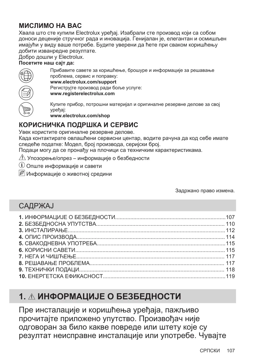 POLSKI Nie wolno wyrzucać urządzeń oznaczonych symbolem razem z odpadami domowymi. Należy zwrócić produkt do miejscowego punktu ponownego przetwarzania lub skontaktować się z odpowiednimi władzami miejskimi. МИСЛИМО НА ВАС Хвала што сте купили Electrolux уређај. Изабрали сте производ који са собом доноси деценије стручног рада и иновација. Генијалан је, елегантан и осмишљен имајући у виду ваше потребе. Будите уверени да ћете при сваком коришћењу добити изванредне резултате. Добро дошли у Electrolux. Посетите наш сајт да: Прибавите савете за коришћење, брошуре и информације за решавање проблема, сервис и поправку: www.electrolux.com/support Региструјте производ ради боље услуге: www.registerelectrolux.com Купите прибор, потрошни материјал и оригиналне резервне делове за свој www.electrolux.com/shop КОРИСНИЧКА ПОДРШКА И СЕРВИС Увек користите оригиналне резервне делове. Када контактирате овлашћени сервисни центар, водите рачуна да код себе имате следеће податке: Модел, број производа, серијски број. Подаци могу да се пронађу на плочици са техничким карактеристикама. Упозорење/опрез – информације о безбедности Опште информације и савети Информације о животној средини Задржано право измена.