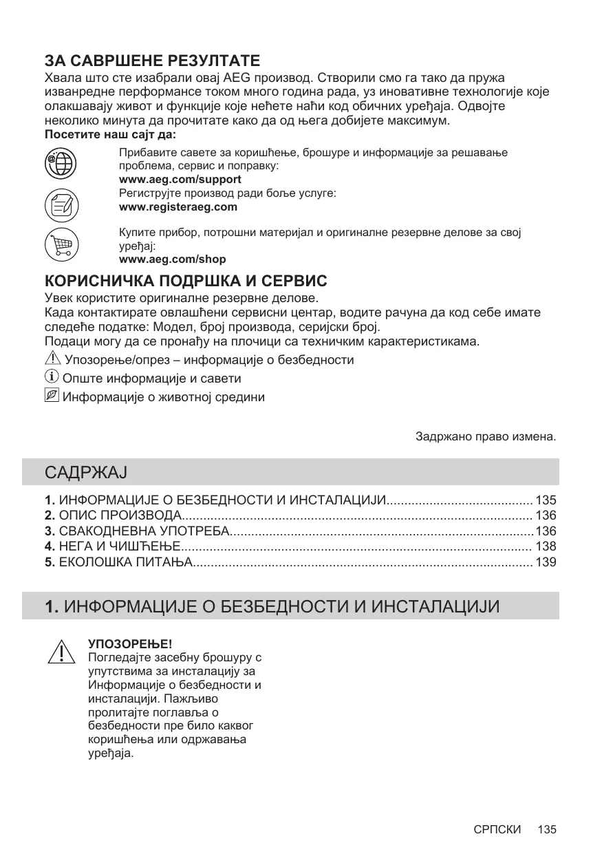 2 Obtenir des conseils d’utilisation, des brochures, un dépanneur, des informations sur le service et les réparations : www.aeg.com/support Enregistrer votre produit pour un meilleur service : www.registeraeg.com Acheter des accessoires, consommables et pièces de rechange d’origine pour votre appareil : www.aeg.com/shop