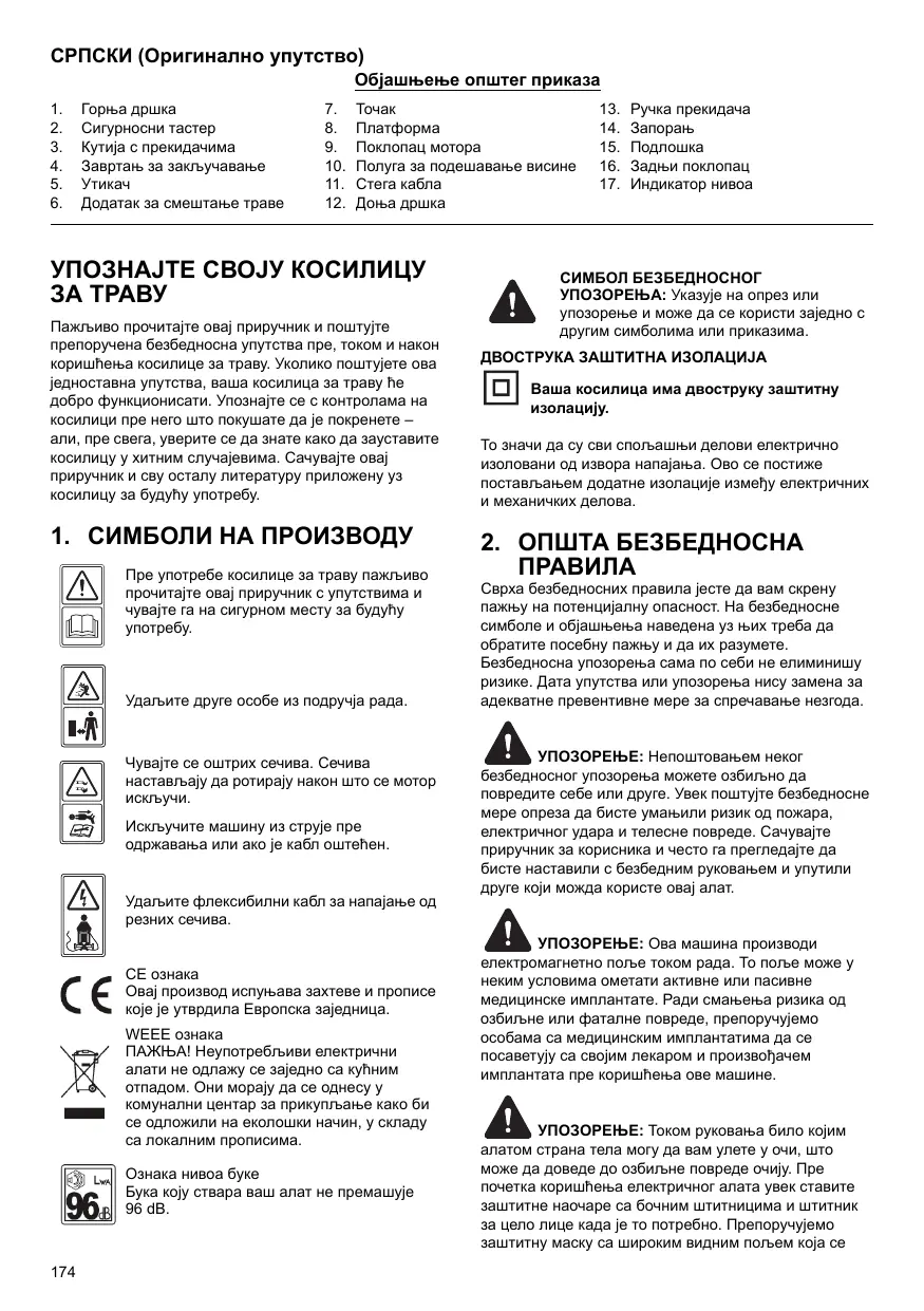 14. Le niveau sonore de votre outil ne dépasse pas 96 dB. SYMBOLE D’ALERTE DE SÉCURITÉ : Indique qu’une précaution ou une mise en garde peut être utilisée avec d’autres symboles ou images. DOUBLE ISOLATION Votre tondeuse est doublement isolée. Cela signifie que toutes les parties externes sont isolées électriquement de l’alimentation. Pour cela, une barrière d’isolation supplémentaire est placée entre les parties électriques et mécaniques.