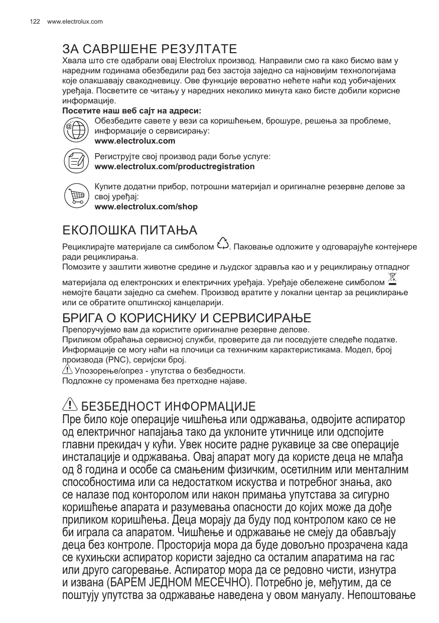 www.electrolux.com ЗА САВРШЕНЕ РЕЗУЛТАТЕ Хвала што сте одабрали овај Electrolux производ. Направили смо га како бисмо вам у наредним годинама обезбедили рад без застоја заједно са најновијим технологијама које олакшавају свакодневицу. Ове функције вероватно нећете наћи код уобичајених уређаја. Посветите се читању у наредних неколико минута како бисте добили корисне информације. Посетите наш веб сајт на адреси: Обезбедите савете у вези са коришћењем, брошуре, решења за проблеме, информације о сервисирању: www.electrolux.com Региструјте свој производ ради боље услуге: www.electrolux.com/productregistration Купите додатни прибор, потрошни материјал и оригиналне резервне делове за свој уређај: www.electrolux.com/shop ЕКОЛОШКА ПИТАЊА Рециклирајте материјале са симболом . Паковање одложите у одговарајуће контејнере ради рециклирања. Помозите у заштити животне средине и људског здравља као и у рециклирању отпадног материјала од електронских и електричних уређаја. Уређаје обележене симболом немојте бацати заједно са смећем. Производ вратите у локални центар за рециклирање или се обратите општинској канцеларији. БРИГА О КОРИСНИКУ И СЕРВИСИРАЊЕ Препоручујемо вам да користите оригиналне резервне делове. Приликом обраћања сервисној служби, проверите да ли поседујете следеће податке. Информације се могу наћи на плочици са техничким карактеристикама. Модел, број производа (PNC), серијски број. Упозорење/опрез - упутства о безбедности. Подложне су променама без претходне најаве. БЕЗБЕДНОСТ ИНФОРМАЦИЈЕ Пре било које операције чишћења или одржавања, одвојите аспиратор од електричног напајања тако да уклоните утичнице или одспојите главни прекидач у кући. Увек носите радне рукавице за све операције инсталације и одржавања. Овај апарат могу да користе деца не млађа од 8 година и особе са смањеним физичким, осетилним или менталним способностима или са недостатком искуства и потребног знања, ако се налазе под конторолом или након примања упутстава за сигурно коришћење апарата и разумевања опасности до којих може да дође приликом коришћења. Деца морају да буду под контролом како се не би играла са апаратом. Чишћење и одржавање не смеју да обављају деца без контроле. Просторија мора да буде довољно прозрачена када се кухињски аспиратор користи заједно са осталим апаратима на гас или друго сагоревање. Аспиратор мора да се редовно чисти, изнутра и извана (БАРЕМ ЈЕДНОМ МЕСЕЧНО). Потребно је, међутим, да се поштују упутства за одржавање наведена у овом мануалу. Непоштовање