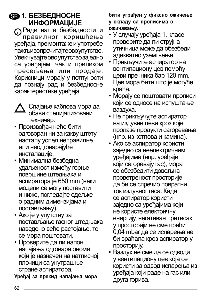 • Pour les appareils de Classe I, s’assurer que l’installation électrique de votre intérieur dispose d’une mise à la terre adéquate. Reliez l’aspirateur du conduit de cheminée avec un tube ayant un diamètre minimum de 120 mm. Le parcours des fumées doit être le plus court possible. Respecter toutes les normes concernant l’évacuation de l’air. Ne reliez pas la hotte aspirante aux conduits de cheminée qui acheminent les fumées de combustion (par ex. de chaudières, de cheminées, etc.). Si vous utilisez l’aspirateur en même temps que des appareils non électriques (par ex. fonctionnant au gaz), veillez à ce que la pièce soit adéquatement ventilée, afin d’empêcher le retour du flux des gaz d’évacuation. Si vous utilisez la hotte de cuisine en même temps que des appareils non alimentés à l’électricité, la pression négative dans la pièce ne doit pas dépasser 0,04 mbar, afin d’éviter que les fumées soient réaspirées dans la pièce où se trouve la hotte. Ne pas évacuer l’air à travers 15