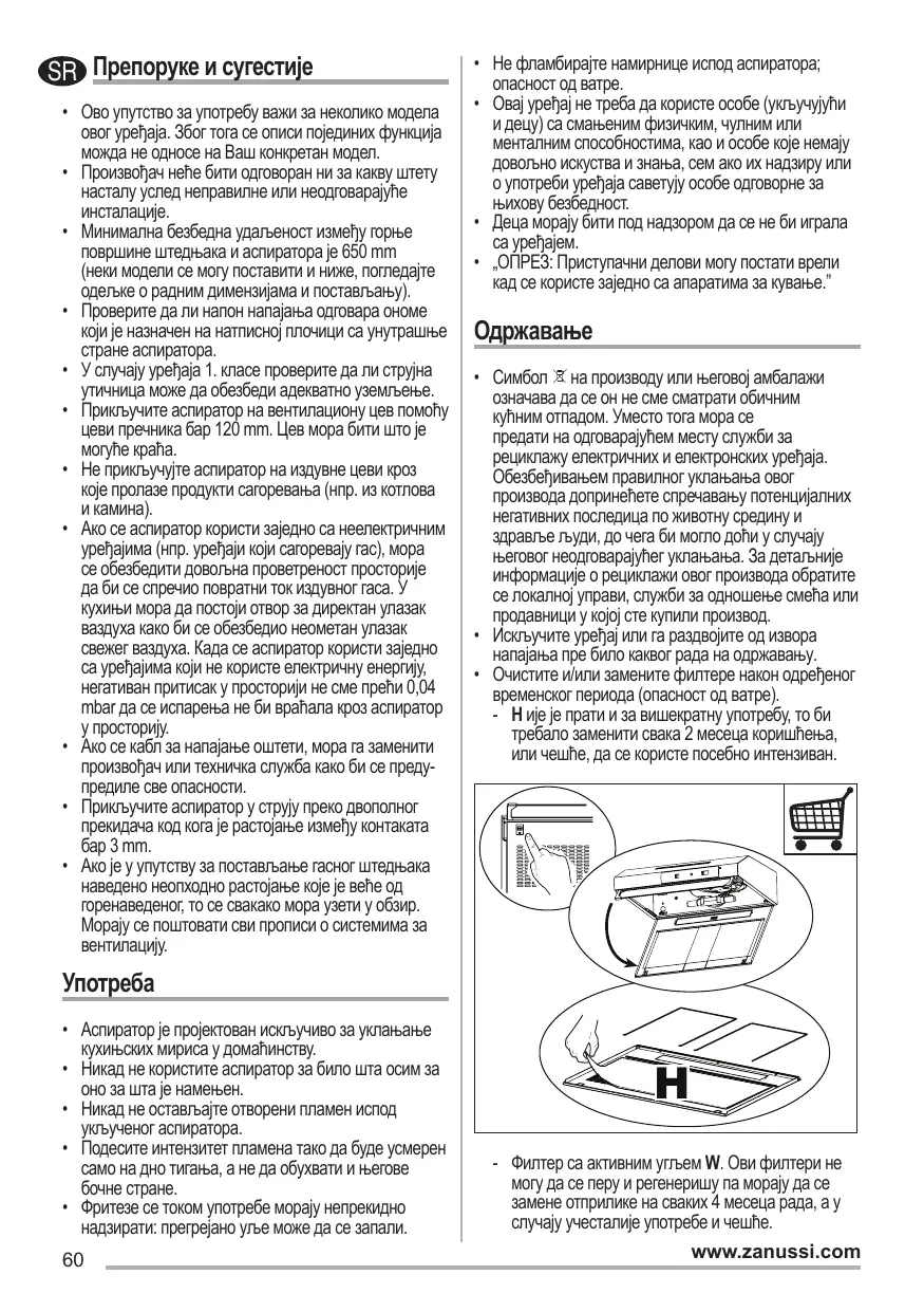 • Симбол на производу или његовој амбалажи означава да се он не сме сматрати обичним кућним отпадом. Уместо тога мора се предати на одговарајућем месту служби за рециклажу електричних и електронских уређаја. Обезбеђивањем правилног уклањања овог производа допринећете спречавању потенцијалних негативних последица по животну средину и здравље људи, до чега би могло доћи у случају његовог неодговарајућег уклањања. За детаљније информације о рециклажи овог производа обратите се локалној управи, служби за одношење смећа или продавници у којој сте купили производ. • Прежде чем приступать к любой операции по уходу, отсоединить вытяжку от сети, вынув электрическую вилку или выключив главный выключатель. • Производить тщательный и своевременный уход за фильтрами в рекомендуемые интервалы времени (Опасность пожара). -- H Не може да се пере нити регенерише па мора да се мења отприлике на свака 2 месеца рада, а у случају веома интензивне употребе и чешће.