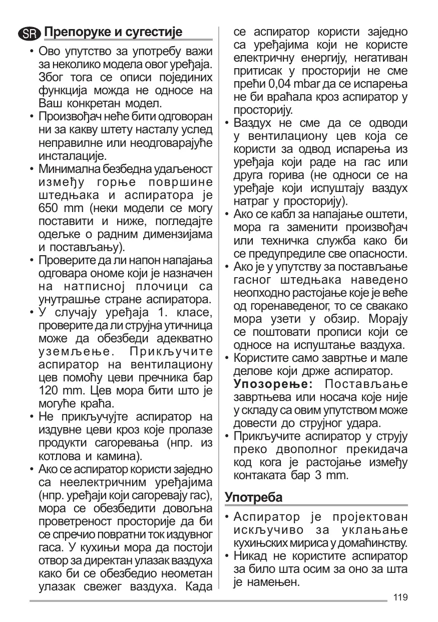 • Brancher la hotte à l’alimentation de secteur avec un interrupteur bipolaire ayant une ouverture des contacts d’au moins 3 mm.