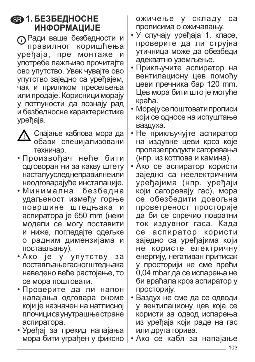 Les dispositifs de sectionnement doivent être montés dans l’installation fixe conformément aux normes sur les systèmes de câblage. Pour les appareils de Classe I, s’assurer que l’installation électrique de votre intérieur dispose d’une mise à la terre adéquate. Reliez l’aspirateur du conduit de cheminée avec un tube ayant un diamètre minimum de 120 mm. Le parcours des fumées doit être le plus court possible. Respecter toutes les normes concernant l’évacuation de l’air. Ne reliez pas la hotte aspirante aux conduits de cheminée qui acheminent les fumées de combustion (par ex. de chaudières, de cheminées, etc.). Si vous utilisez l’aspirateur en même temps que des appareils non électriques (par ex. fonctionnant au gaz), veillez à ce que la pièce soit adéquatement ventilée, afin d’empêcher le retour du flux des gaz d’évacuation. Si vous utilisez la hotte de cuisine en même temps que des appareils non alimentés à l’électricité, la pression négative dans la pièce ne doit pas dépasser 0,04 mbar, afin d’éviter que les fumées soient réaspirées dans la pièce où se trouve la hotte.