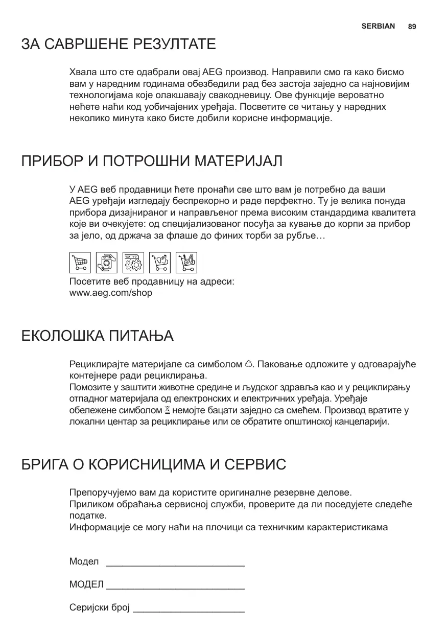 ЗА САВРШЕНЕ РЕЗУЛТАТЕ Хвала што сте одабрали овај AEG производ. Направили смо га како бисмо вам у наредним годинама обезбедили рад без застоја заједно са најновијим технологијама које олакшавају свакодневицу. Ове функције вероватно нећете наћи код уобичајених уређаја. Посветите се читању у наредних неколико минута како бисте добили корисне информације. ПРИБОР И ПОТРОШНИ МАТЕРИЈАЛ У AEG веб продавници ћете пронаћи све што вам је потребно да ваши AEG уређаји изгледају беспрекорно и раде перфектно. Ту је велика понуда прибора дизајнираног и направљеног према високим стандардима квалитета које ви очекујете: од специјализованог посуђа за кување до корпи за прибор за јело, од држача за флаше до финих торби за рубље… Посетите веб продавницу на адреси: www.aeg.com/shop ЕКОЛОШКА ПИТАЊА Рециклирајте материјале са симболом . Паковање одложите у одговарајуће контејнере ради рециклирања. Помозите у заштити животне средине и људског здравља као и у рециклирању отпадног материјала од електронских и електричних уређаја. Уређаје обележене симболом немојте бацати заједно са смећем. Производ вратите у локални центар за рециклирање или се обратите општинској канцеларији. БРИГА О КОРИСНИЦИМА И СЕРВИС Препоручујемо вам да користите оригиналне резервне делове. Приликом обраћања сервисној служби, проверите да ли поседујете следеће Информације се могу наћи на плочици са техничким карактеристикама Moдел ___________________________ МОДЕЛ __________________________ Серијски број ______________________ 90 www.aeg.com