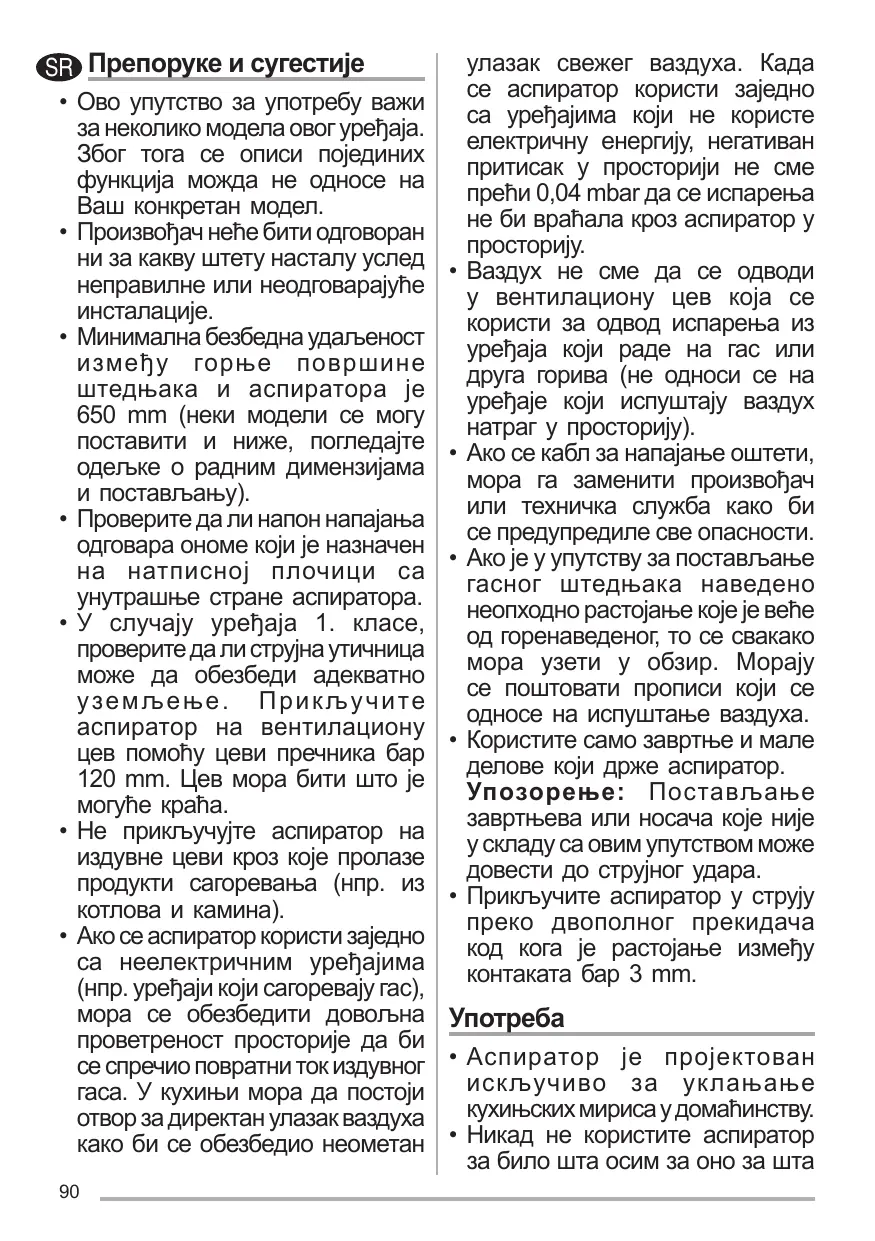 • Compruebe que la tensión de alimentación corresponda a la indicada en la placa de datos colocada en el interior de la campana. • Para los aparatos de Clase I, compruebe que la red eléctrica doméstica tenga una conexión a tierra adecuada. Conecte la campana extractora al conducto de humo a través de un tubo con un diámetro mínimo de 120 mm. La trayectoria del humo debe ser lo más corta posible. • No conecte la campana extractora a los conductos de humo que transportan humo de combustión (ej. calderas, chimeneas, etc.). • Si la campana extractora se utiliza en combinación con aparatos no eléctricos (por ejemplo, aparatos de gas), debe garantizarse