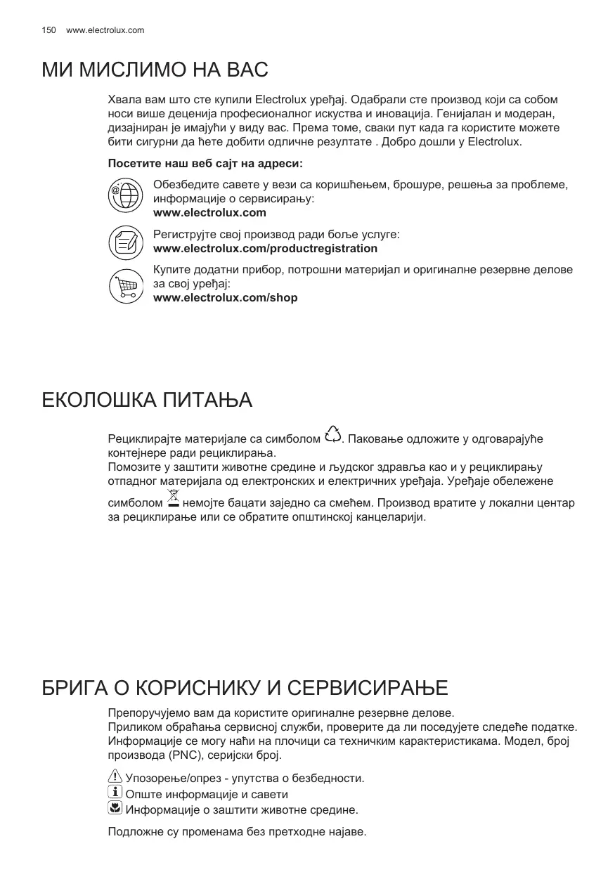 МИ МИСЛИМО НА ВАС Хвала вам што сте купили Electrolux уређај. Одабрали сте производ који са собом носи више деценија професионалног искуства и иновација. Генијалан и модеран, дизајниран је имајући у виду вас. Према томе, сваки пут када га користите можете бити сигурни да ћете добити одличне резултате . Добро дошли у Electrolux. Посетите наш веб сајт на адреси: Обезбедите савете у вези са коришћењем, брошуре, решења за проблеме, информације о сервисирању: www.electrolux.com Региструјте свој производ ради боље услуге: www.electrolux.com/productregistration Купите додатни прибор, потрошни материјал и оригиналне резервне делове за свој уређај: www.electrolux.com/shop