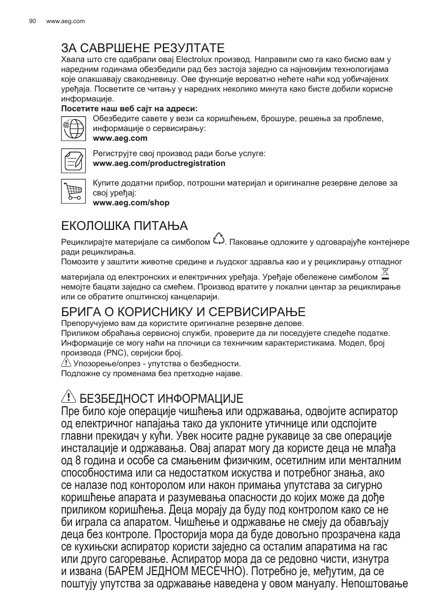 Хвала што сте одабрали овај Electrolux производ. Направили смо га како бисмо вам у наредним годинама обезбедили рад без застоја заједно са најновијим технологијама које олакшавају свакодневицу. Ове функције вероватно нећете наћи код уобичајених уређаја. Посветите се читању у наредних неколико минута како бисте добили корисне информације. Посетите наш веб сајт на адреси: Обезбедите савете у вези са коришћењем, брошуре, решења за проблеме, информације о сервисирању: www.aeg.com Региструјте свој производ ради боље услуге: www.aeg.com/productregistration Купите додатни прибор, потрошни материјал и оригиналне резервне делове за свој уређај: www.aeg.com/shop