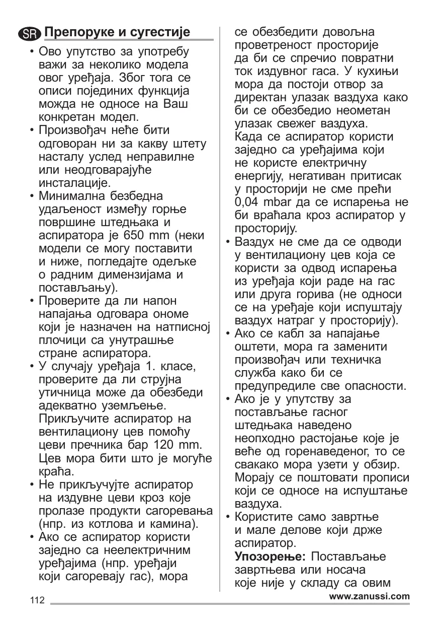 SR Препоруке и сугестије • Ово упутство за употребу важи за неколико модела овог уређаја. Због тога се описи појединих функција можда не односе на Ваш конкретан модел. • Произвођач неће бити одговоран ни за какву штету насталу услед неправилне или неодговарајуће инсталације. • Минимална безбедна удаљеност између горње површине штедњака и аспиратора је 650 mm (неки модели се могу поставити и ниже, погледајте одељке о радним димензијама и постављању). • Проверите да ли напон напајања одговара ономе који је назначен на натписној плочици са унутрашње стране аспиратора. • У случају уређаја 1. класе, проверите да ли струјна утичница може да обезбеди адекватно уземљење. Прикључите аспиратор на вентилациону цев помоћу цеви пречника бар 120 mm. Цев мора бити што је могуће краћа. • Не прикључујте аспиратор на издувне цеви кроз које пролазе продукти сагоревања (нпр. из котлова и камина). • Ако се аспиратор користи заједно са неелектричним уређајима (нпр. уређаји који сагоревају гас), мора 112