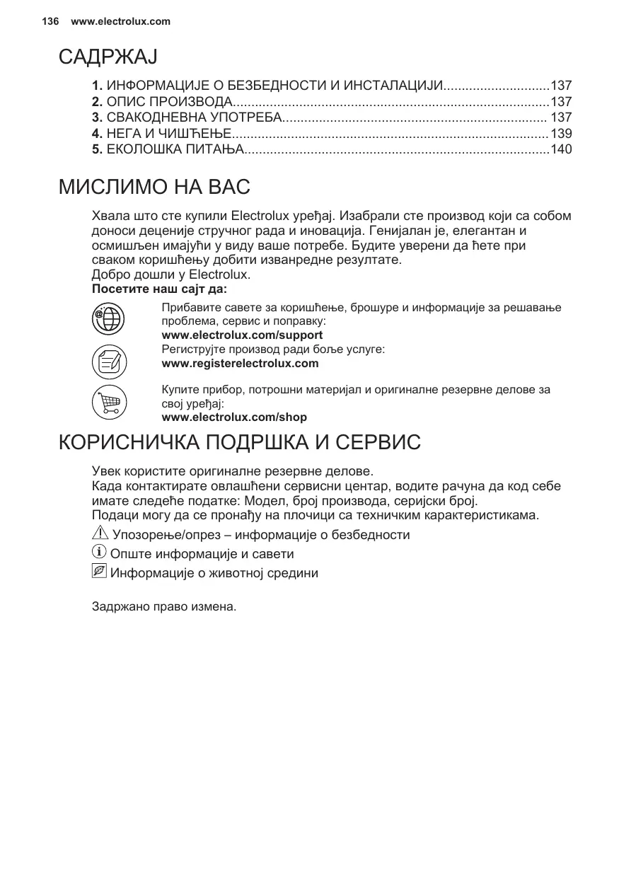 МИСЛИМО НА ВАС Хвала што сте купили Electrolux уређај. Изабрали сте производ који са собом доноси деценије стручног рада и иновација. Генијалан је, елегантан и осмишљен имајући у виду ваше потребе. Будите уверени да ћете при сваком коришћењу добити изванредне резултате. Добро дошли у Electrolux. Посетите наш сајт да: Прибавите савете за коришћење, брошуре и информације за решавање проблема, сервис и поправку: www.electrolux.com/support Региструјте производ ради боље услуге: www.registerelectrolux.com Купите прибор, потрошни материјал и оригиналне резервне делове за свој уређај: www.electrolux.com/shop КОРИСНИЧКА ПОДРШКА И СЕРВИС Увек користите оригиналне резервне делове. Када контактирате овлашћени сервисни центар, водите рачуна да код себе имате следеће податке: Модел, број производа, серијски број. Подаци могу да се пронађу на плочици са техничким карактеристикама. Упозорење/опрез – информације о безбедности Опште информације и савети Информације о животној средини Задржано право измена.