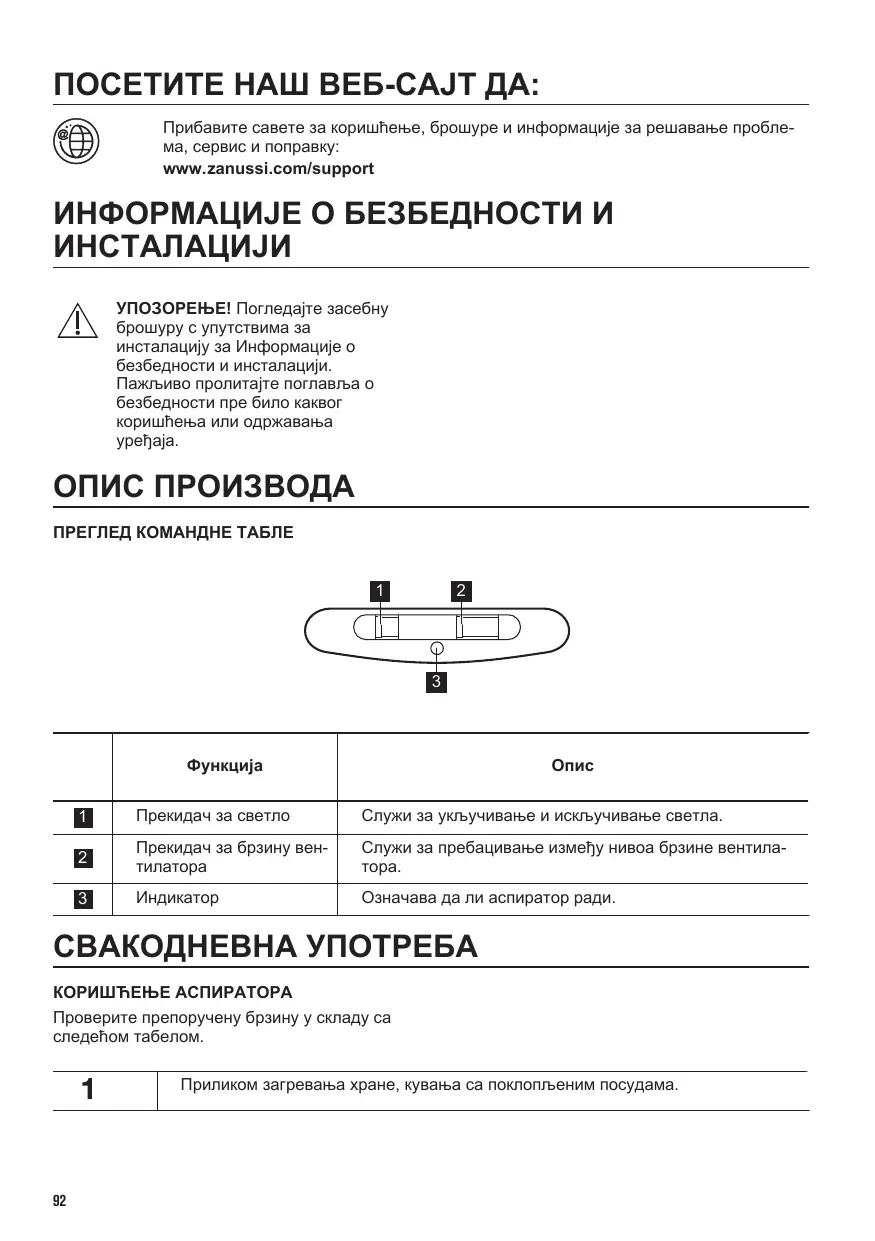 ПОСЕТИТЕ НАШ ВЕБ-САЈТ ДА: Прибавите савете за коришћење, брошуре и информације за решавање пробле‐ ма, сервис и поправку: www.zanussi.com/support