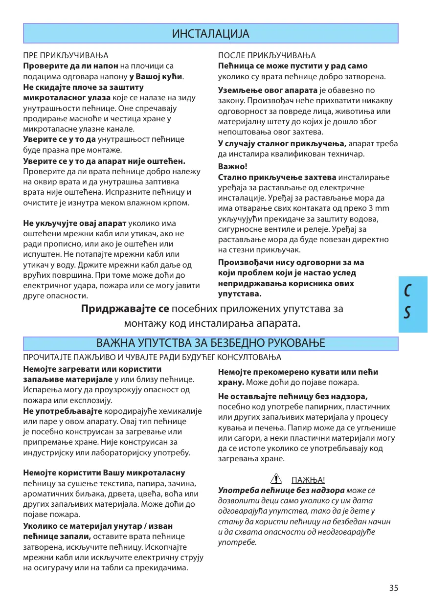 MЕРЕ ПРЕДОСТРОЖНОСТИ ОПШТИ САВЕТИ Оваj апарат jе конструисан само за домаћу употребу! Апарат не сме да се укључује без хране у пећници код коришћења микроталаса. Овакав рад може највероватниjе довести до оштећења апарата.