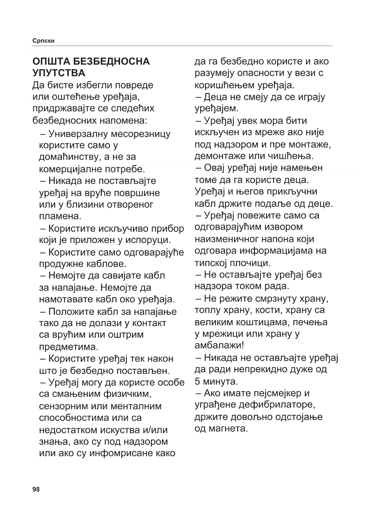 Да бисте избегли повреде или оштећење уређаја, придржавајте се следећих безбедносних напомена: – Универзалну месорезницу користите само у домаћинству, а не за комерцијалне потребе. – Никада не постављајте уређај на вруће површине или у близини отвореног