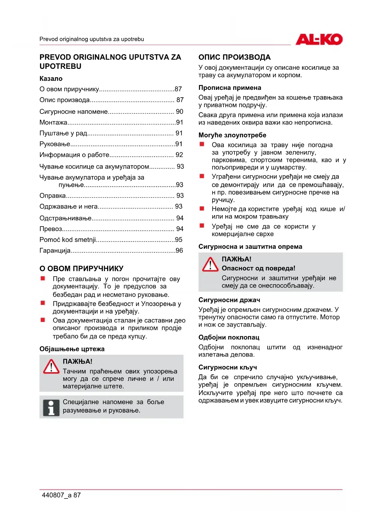 Téléchargez la notice de votre косилица au format PDF gratuitement ! Retrouvez votre notice Comfort 38.4 Li - AL-KO et reprennez votre appareil électronique en main. Sur cette page sont publiés tous les documents nécessaires à l'utilisation de votre appareil Comfort 38.4 Li de la marque AL-KO.