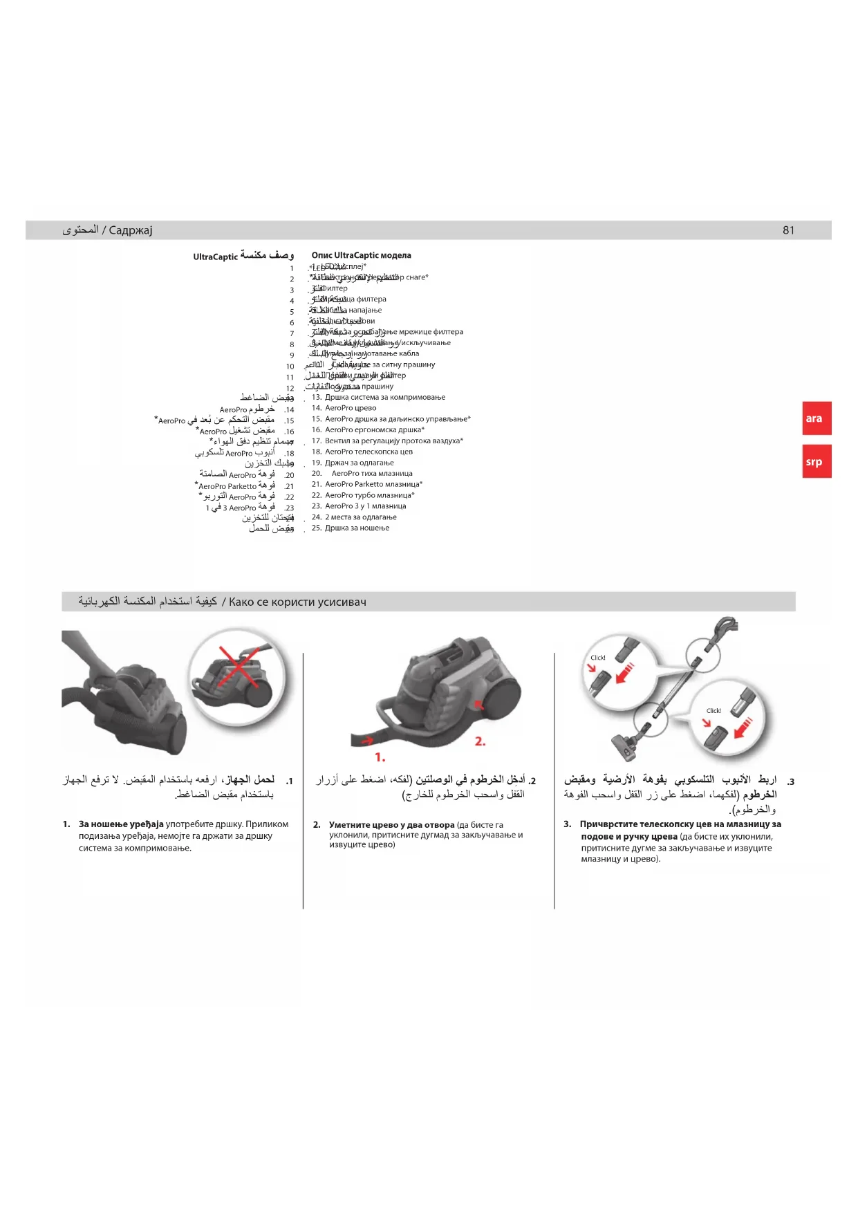 UltraCaptic_Electrolux.indd 80 2014-05-07 08:03:12Опис UltraCaptic модела1. LEDдисплеј*2. Електронски регулатор снаге*3. Филтер4. Мрежица филтера5. Кабл за напајање6. Задњи точкови7. Дугме за ослобађање мрежице филтера8. Дугме за укључивање/искључивање9. Дугме за намотавање кабла10. Складиште за ситну прашину11. Периви главни филтер12. Посуда за прашину13. Дршка система за компримовање14. AeroPro црево15. AeroPro дршка за даљинско управљање*16. AeroPro ергономска дршка*17. Вентил за регулацију протока ваздуха*18. AeroPro телескопска цев19. Држач за одлагање20. AeroPro тиха млазница21. AeroPro Parketto млазница*22. AeroPro турбо млазница*23. AeroPro 3 у 1 млазница24. 2 места за одлагање25. Дршка за ношењеUltraCaptic 1 .*LED 2 .3 .4 .5 .6 .7 .8 .9 .10 .11 .12 .13 . 14 .AeroPro