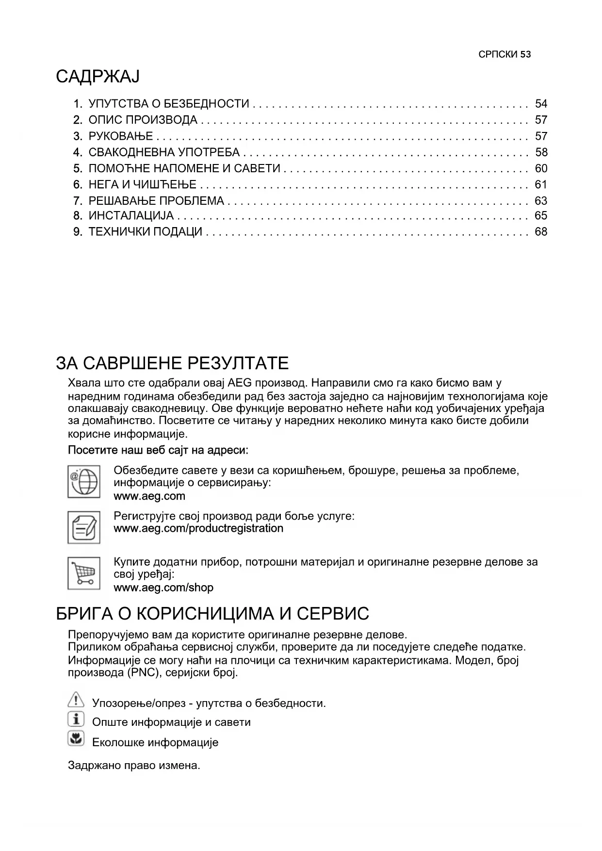 8. ИНСТАЛАЦИЈА . . . . . . . . . . . . . . . . . . . . . . . . . . . . . . . . . . . . . . . . . . . . . . . . . . . . . . . 65 9. ТЕХНИЧКИ ПОДАЦИ . . . . . . . . . . . . . . . . . . . . . . . . . . . . . . . . . . . . . . . . . . . . . . . . . . . 68 ЗА САВРШЕНЕ РЕЗУЛТАТЕ Хвала што сте одабрали овај AEG производ. Направили смо га како бисмо вам у наредним годинама обезбедили рад без застоја заједно са најновијим технологијама које олакшавају свакодневицу. Ове функције вероватно нећете наћи код уобичајених уређаја за домаћинство. Посветите се читању у наредних неколико минута како бисте добили корисне информације. Посетите наш веб сајт на адреси: Обезбедите савете у вези са коришћењем, брошуре, решења за проблеме, информације о сервисирању: www.aeg.com Региструјте свој производ ради боље услуге: www.aeg.com/productregistration Купите додатни прибор, потрошни материјал и оригиналне резервне делове за свој уређај: www.aeg.com/shop БРИГА О КОРИСНИЦИМА И СЕРВИС Препоручујемо вам да користите оригиналне резервне делове. Приликом обраћања сервисној служби, проверите да ли поседујете следеће податке. Информације се могу наћи на плочици са техничким карактеристикама. Модел, број производа (PNC), серијски број. Упозорење/опрез - упутства о безбедности. Опште информације и савети Еколошке информације Задржано право измена. СРПСКИ 531. УПУТСТВА О БЕЗБЕДНОСТИ У интересу Ваше безбедности и да би се обезбедила правилна употреба, пре инсталације пажљиво прочитајте ово упутство, укључујући његове саве‐ те и упозорења. Да бисте избегли не‐ потребне грешке и незгоде, важно је да се обезбеди да све особе које ко‐ ристе машину за прање посуђа буду потпуно упознате са њеним радом и карактеристикама безбедности. Чувај‐ те ова упутства и проверите да ли се налазе са машином за прање посуђа уколико се премешта или прода, тако да свако ко је користи у току њеног ве‐ ка трајања може да буде правилно ин‐ формисан о употреби и безбедности