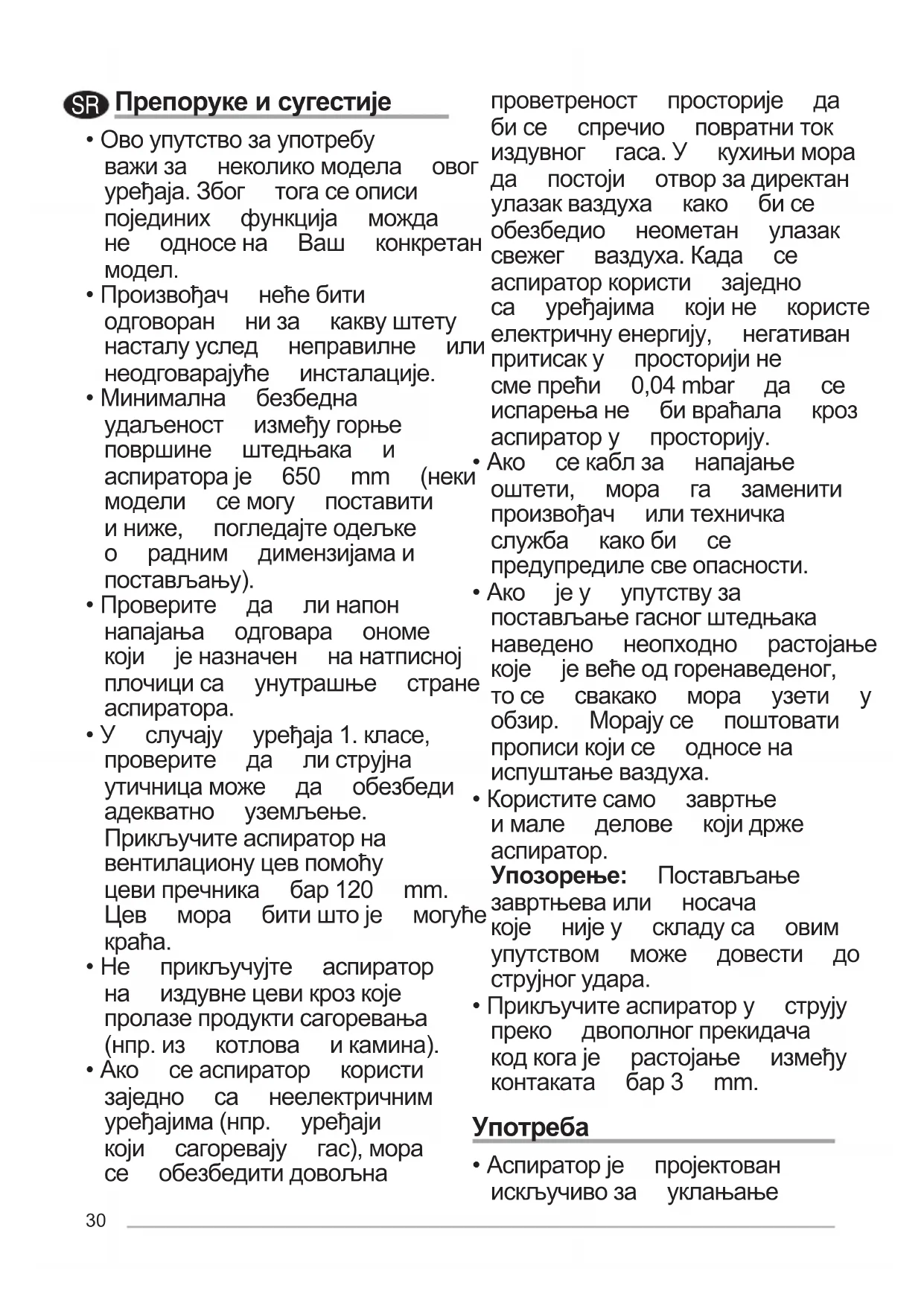 - Ако сеаспиратор користи заједно са неелектричним уређајима(нпр. уређаји који сагоревају гас),мора се обезбедитидовољна проветреност просторије да бисе спречио повратниток издувног гаса.У кухињимора да постоји отворзадиректан улазакваздуха како бисе обезбедио неометан улазак свежег ваздуха.Када се аспираторкористи заједно са уређајима којине користе електричнуенергију, негативан притисаку просторијине смепрећи 0,04mbar да се испарењане бивраћала кроз аспиратору просторију.