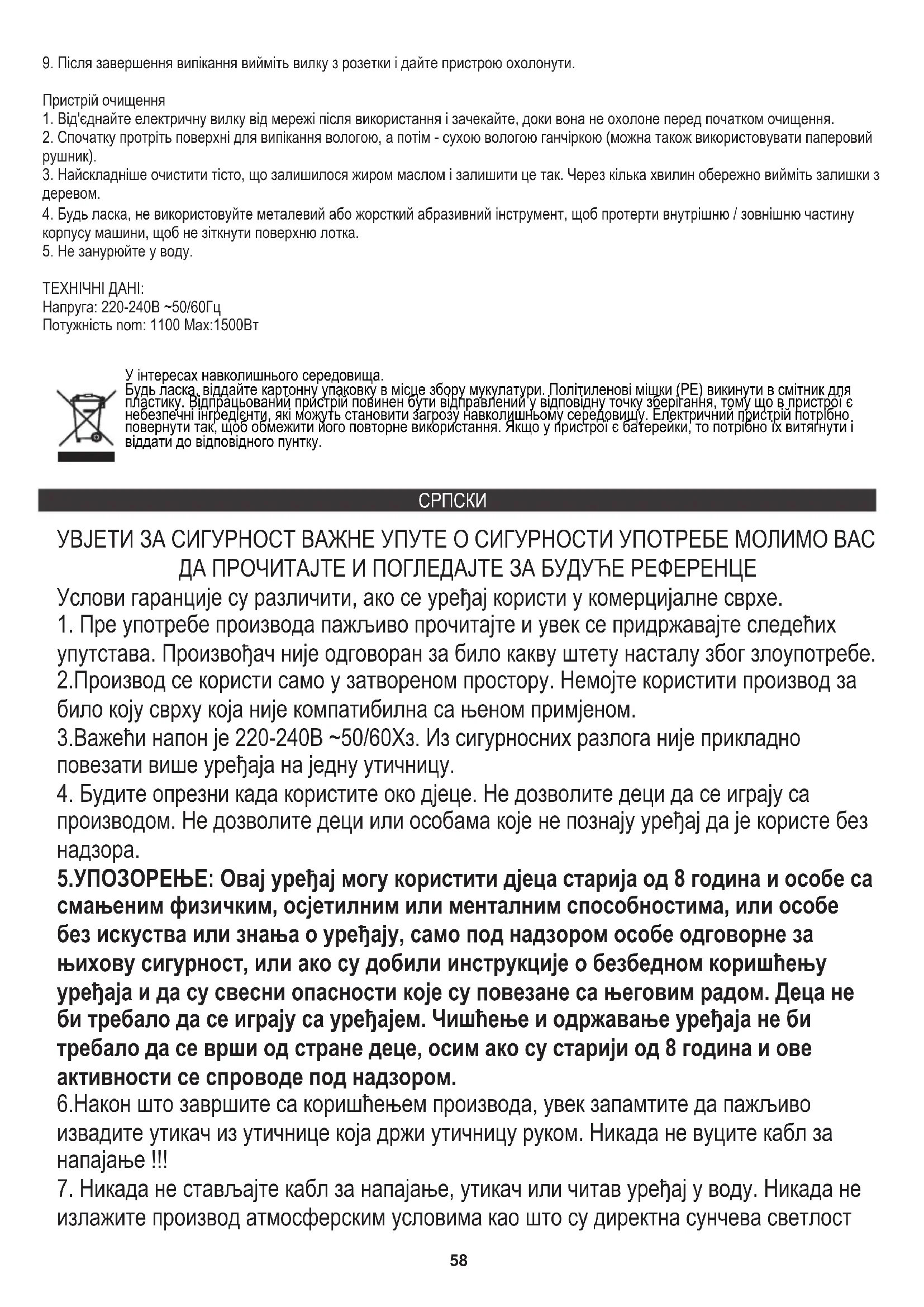упутстава. Произвођач није одговоран за било какву штету насталу због злоупотребе. 3.Важећи напон је 220-240В ~50/60Хз. Из сигурносних разлога није прикладно повезати више уређаја на једну утичницу. 5.УПОЗОРЕЊЕ: Овај уређај могу користити дјеца старија од 8 година и особе са смањеним физичким, осјетилним или менталним способностима, или особе без искуства или знања о уређају, само под надзором особе одговорне за њихову сигурност, или ако су добили инструкције о безбедном коришћењу уређаја и да су свесни опасности које су повезане са његовим радом. Деца не би требало да се играју са уређајем. Чишћење и одржавање уређаја не би требало да се врши од стране деце, осим ако су старији од 8 година и ове активности се спроводе под надзором. 6.Након што завршите са коришћењем производа, увек запамтите да пажљиво извадите утикач из утичнице која држи утичницу руком. Никада не вуците кабл за напајање !!!