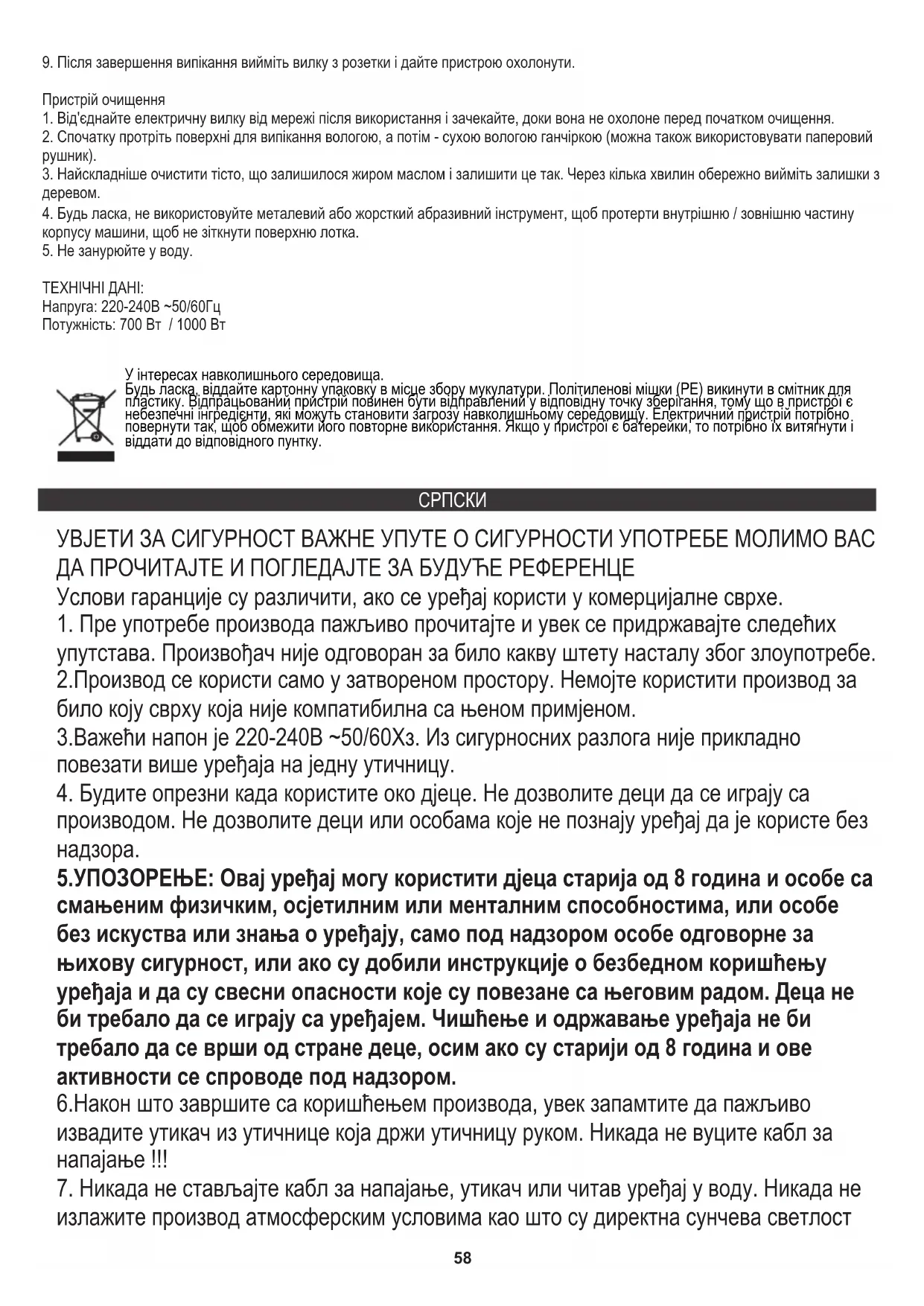 упутстава. Произвођач није одговоран за било какву штету насталу због злоупотребе. 2.Производ се користи само у затвореном простору. Немојте користити производ за било коју сврху која није компатибилна са њеном примјеном. 3.Важећи напон је 220-240В ~50/60Хз. Из сигурносних разлога није прикладно повезати више уређаја на једну утичницу. 6.Након што завршите са коришћењем производа, увек запамтите да пажљиво извадите утикач из утичнице која држи утичницу руком. Никада не вуците кабл за напајање !!! 5.УПОЗОРЕЊЕ: Овај уређај могу користити дјеца старија од 8 година и особе са смањеним физичким, осјетилним или менталним способностима, или особе без искуства или знања о уређају, само под надзором особе одговорне за њихову сигурност, или ако су добили инструкције о безбедном коришћењу уређаја и да су свесни опасности које су повезане са његовим радом. Деца не би требало да се играју са уређајем. Чишћење и одржавање уређаја не би требало да се врши од стране деце, осим ако су старији од 8 година и ове активности се спроводе под надзором.