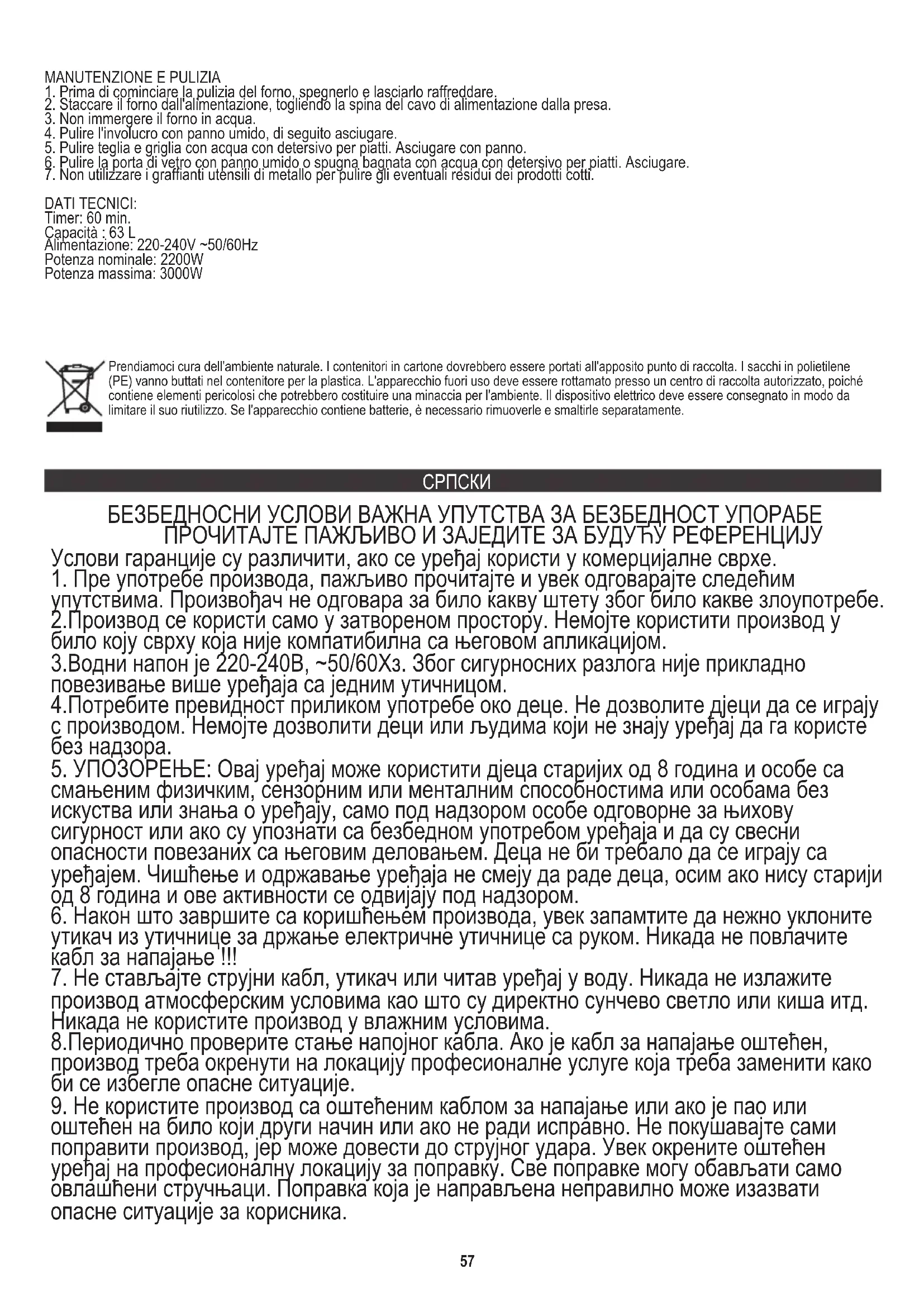 59Тајмер: 60 мин. Напајање: 220-240В ~ 50 / 60Хз Снага: 2200В Капацитет: 63 Л Снага МАКС: 3000В За заштиту животне средине: молимо вас да одвојите картонске кутије и пластичне кесе и одложите их у одговарајуће канте за смеће. Коришћени уређај треба да буде испоручен на наменске сакупљане тачке због оштрих компоненти, што може утицати на животну средину. Немојте одлагати овај уређај у заједничку корпу за отпатке.