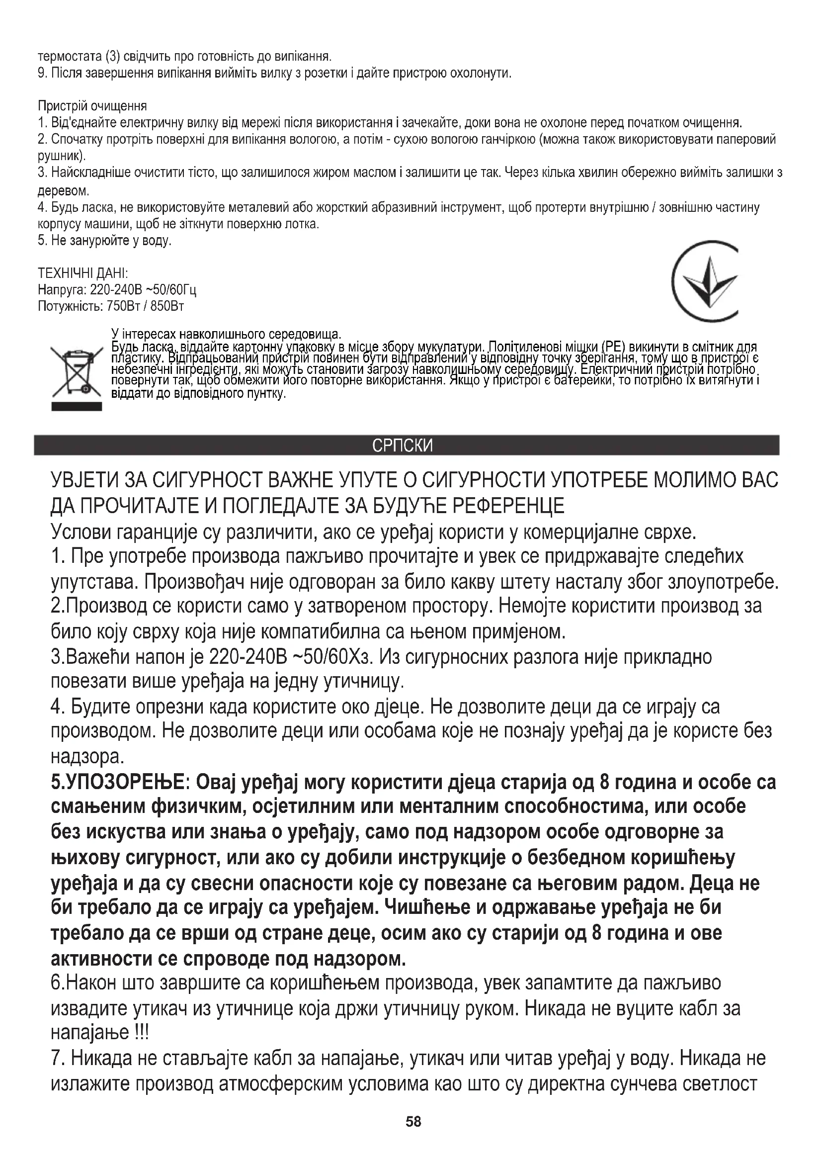 упутстава. Произвођач није одговоран за било какву штету насталу због злоупотребе. 5.УПОЗОРЕЊЕ: Овај уређај могу користити дјеца старија од 8 година и особе са смањеним физичким, осјетилним или менталним способностима, или особе без искуства или знања о уређају, само под надзором особе одговорне за њихову сигурност, или ако су добили инструкције о безбедном коришћењу уређаја и да су свесни опасности које су повезане са његовим радом. Деца не би требало да се играју са уређајем. Чишћење и одржавање уређаја не би требало да се врши од стране деце, осим ако су старији од 8 година и ове активности се спроводе под надзором. 6.Након што завршите са коришћењем производа, увек запамтите да пажљиво извадите утикач из утичнице која држи утичницу руком. Никада не вуците кабл за напајање !!!