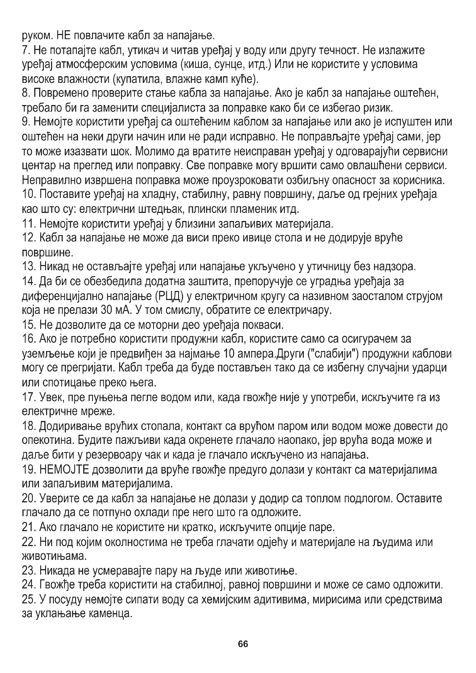 Да бисте повећали безбедност употребе, немојте истовремено укључити многе електричне уређаје у један круг. ВАЖНЕ УПУТЕ ЗА СИГУРНОСТ УПОТРЕБЕ