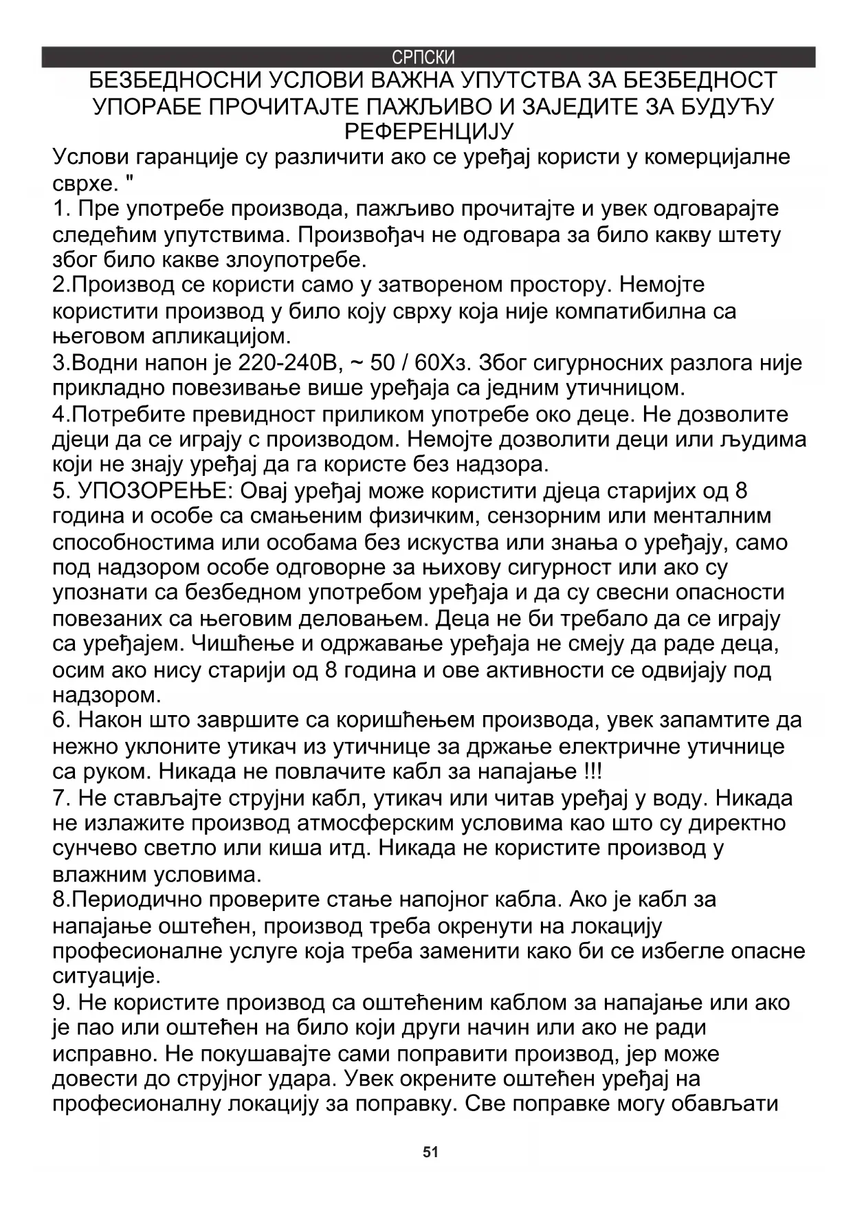 БЕЗБЕДНОСНИ УСЛОВИ ВАЖНА УПУТСТВА ЗА БЕЗБЕДНОСТ УПОРАБЕ ПРОЧИТАЈТЕ ПАЖЉИВО И ЗАЈЕДИТЕ ЗА БУДУЋУ РЕФЕРЕНЦИЈУ Услови гаранције су различити ако се уређај користи у комерцијалне
