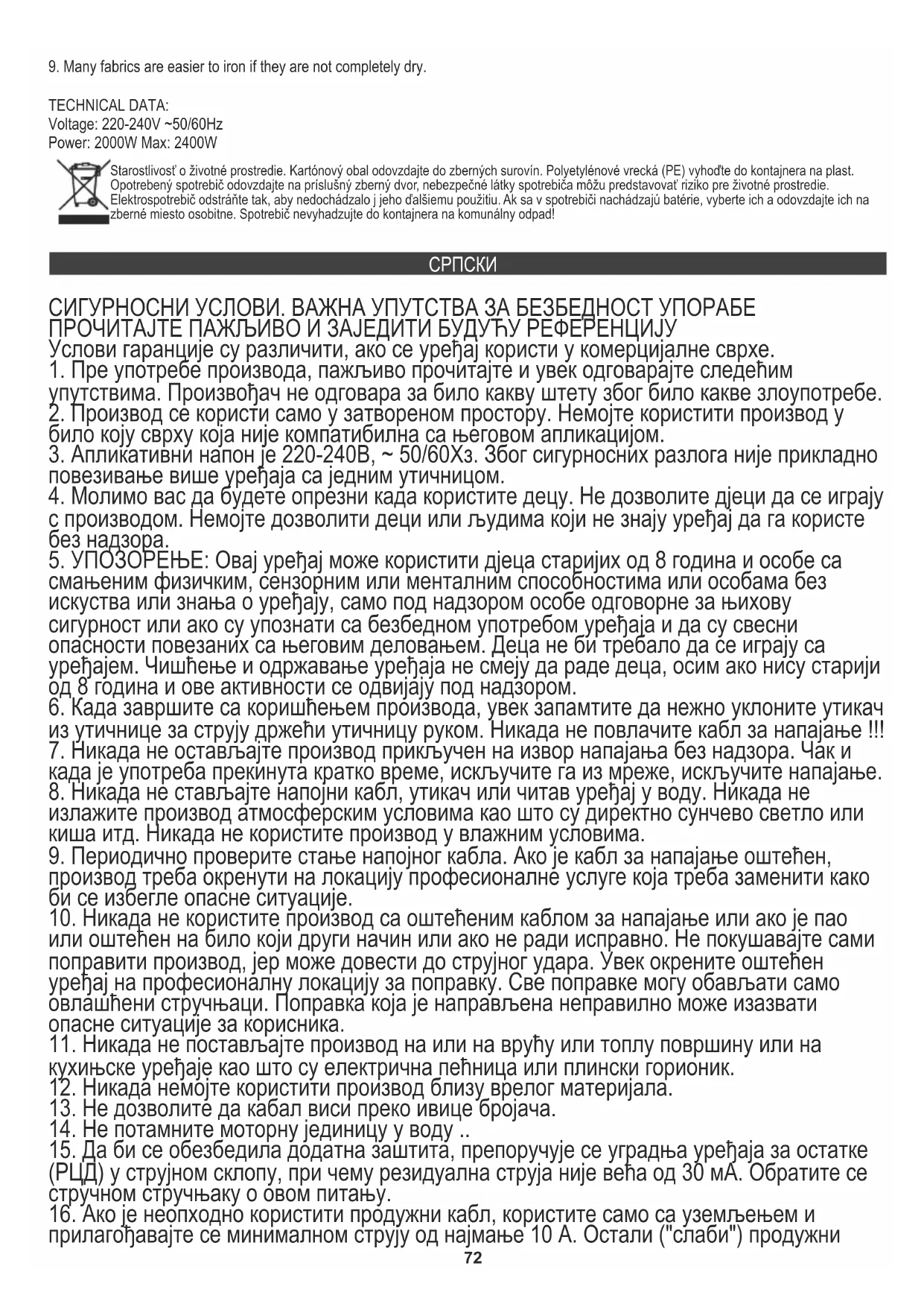 ТЕХНИЧКИ ПОДАЦИ: Напон: 220-240В ~ 50 / 60Хз Снага: 2000В Мак: 2400В За заштиту животне средине: молимо вас да одвојите картонске кутије и пластичне кесе и одложите их у одговарајуће канте за смеће. Коришћени уређај треба да буде испоручен на наменске сакупљане тачке због оштрих компоненти, што може утицати на животну средину. Немојте одлагати овај уређај у заједничку корпу за отпатке.