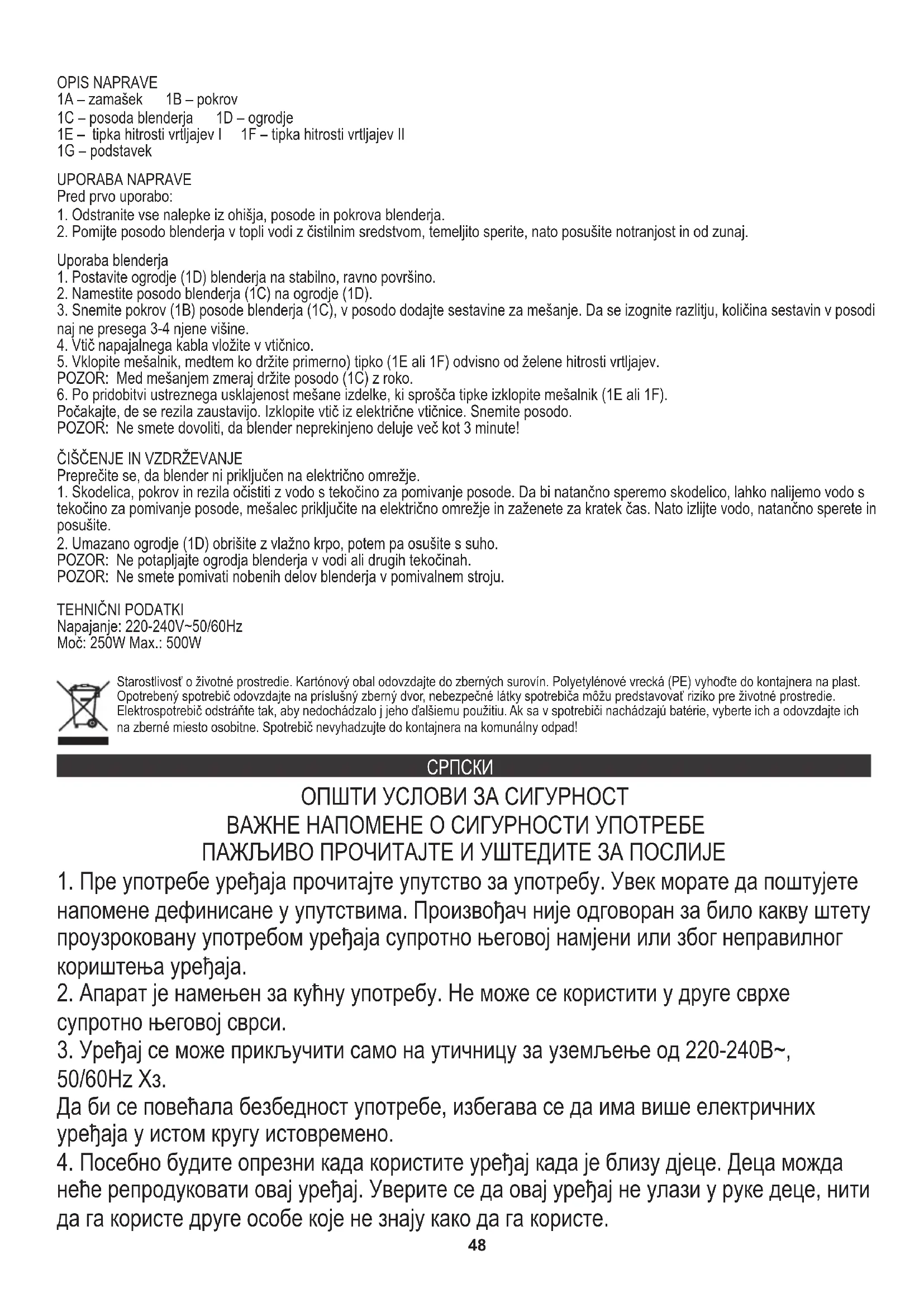 у чашу ставите мало воде са средством за прање посуђа, спојите блендер са струјом и пустите га да ради кратко време. Затим излијте воду, добро исперите и осушите. НАПОМЕНА: Током мешања увек држите шалицу (1Ц) руком. Напон: 220-240В ~ 50 / 60Хз ЧИШЋЕЊЕ И ОДРЖАВАЊЕ Уверите се да је блендер искључен из напајања.