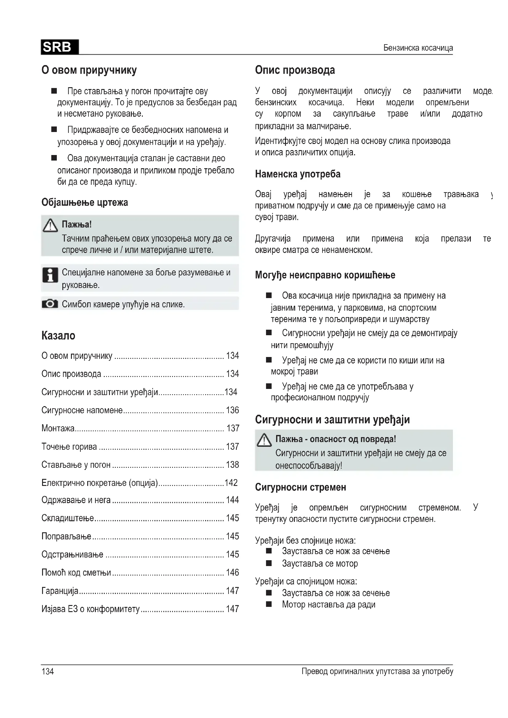 Симболкамереупућујенаслике. Опис производа У овој документацији описују се различити модели бензинских косачица. Неки модели опремљени су корпом за сакупљање траве и/или додатно су прикладнизамалчирање. Идентифкујтесвојмоделнаосновусликапроизвода иописаразличитихопција. Наменска употреба Овај уређај намењен је за кошење травњака у приватномподручјуисмедасепримењујесамона сувојтрави. Другачија примена или примена која прелази те оквиресматрасененаменском. Могуђе неисправно коришћење Овакосачицанијеприкладназаприменуна јавнимтеренима,упарковима,наспортским терениматеупољопривредиишумарству Сигурносниуређајинесмејудаседемонтирају нитипремошћују Уређајнесмедасекористипокишиилина мокројтрави Уређајнесмедасеупотребљавау професионалномподручју Сигурносни и заштитни уређаји Пажња - опасност од повреда! Сигурносниизаштитниуређајинесмејудасе онеспособљавају! Сигурносни стремен Уређај је опремљен сигурносним стременом. У тренуткуопасностипуститесигурноснистремен. Уређајибезспојниценожа: Заустављасеножзасечење Заустављасемотор Уређајисаспојницомножа: Заустављасеножзасечење Моторнастављадаради