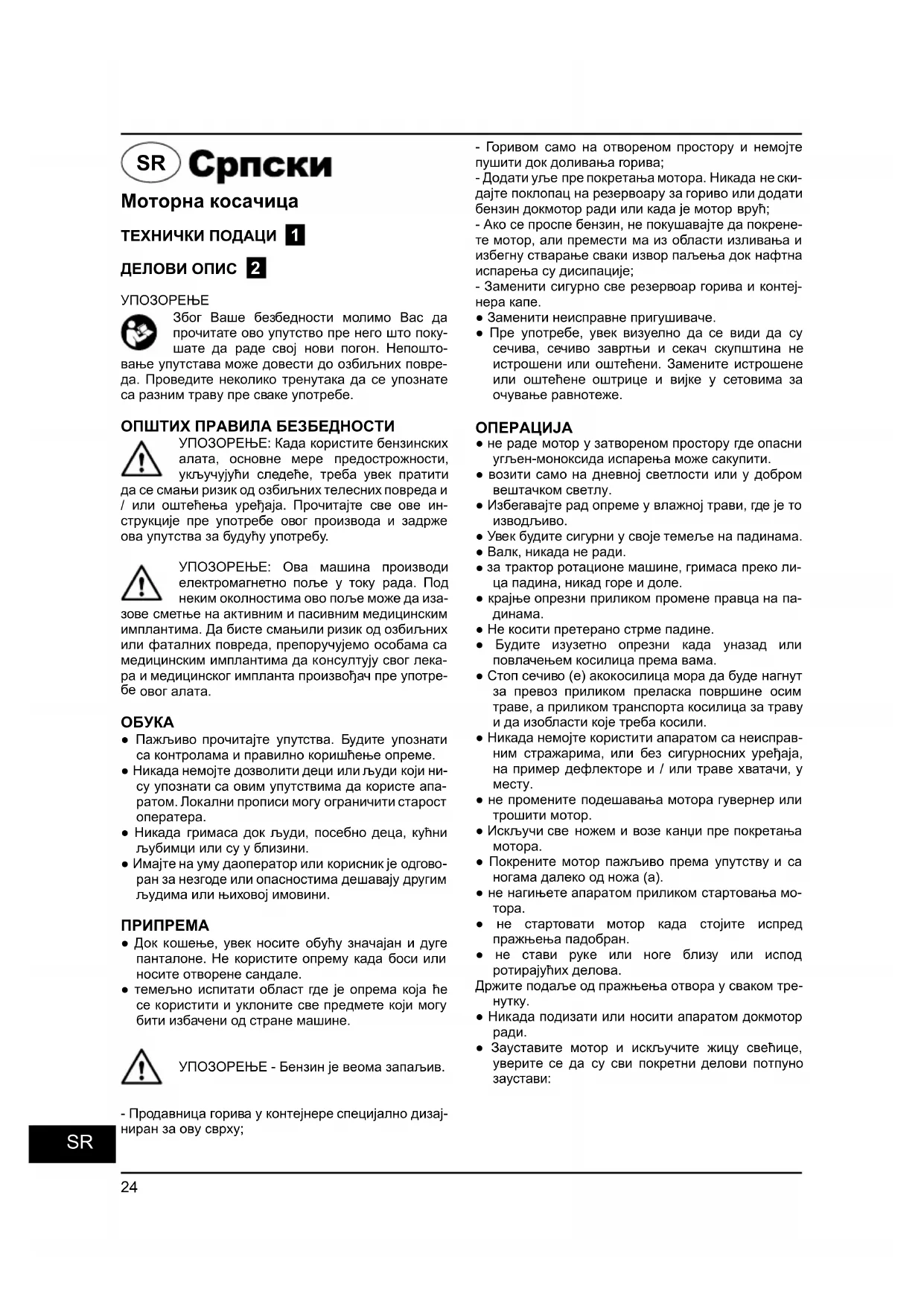 SR25 УПОЗОРЕЊЕ: Никада попуните затворе- ном простору за гориво, док мотор ради или докмотор је дозвољено да се охлади најмање 15 минута након трчања. Упали мотор пажљиво према упутству и са ногама далеко од сечива. Немојте нагињати апаратом приликом стартовања мотора. Покрените косилицу на равној површини, бесплатно високе траве или препрека. Држите руке и ноге даље од ротирајућих делова. Не стартовати мотор када стојите испред пражњења отварања. ПРОЦЕДУРЕ ДЕЛАТНОСТИ Током рада, чврсто држите ручицу стоп команда са