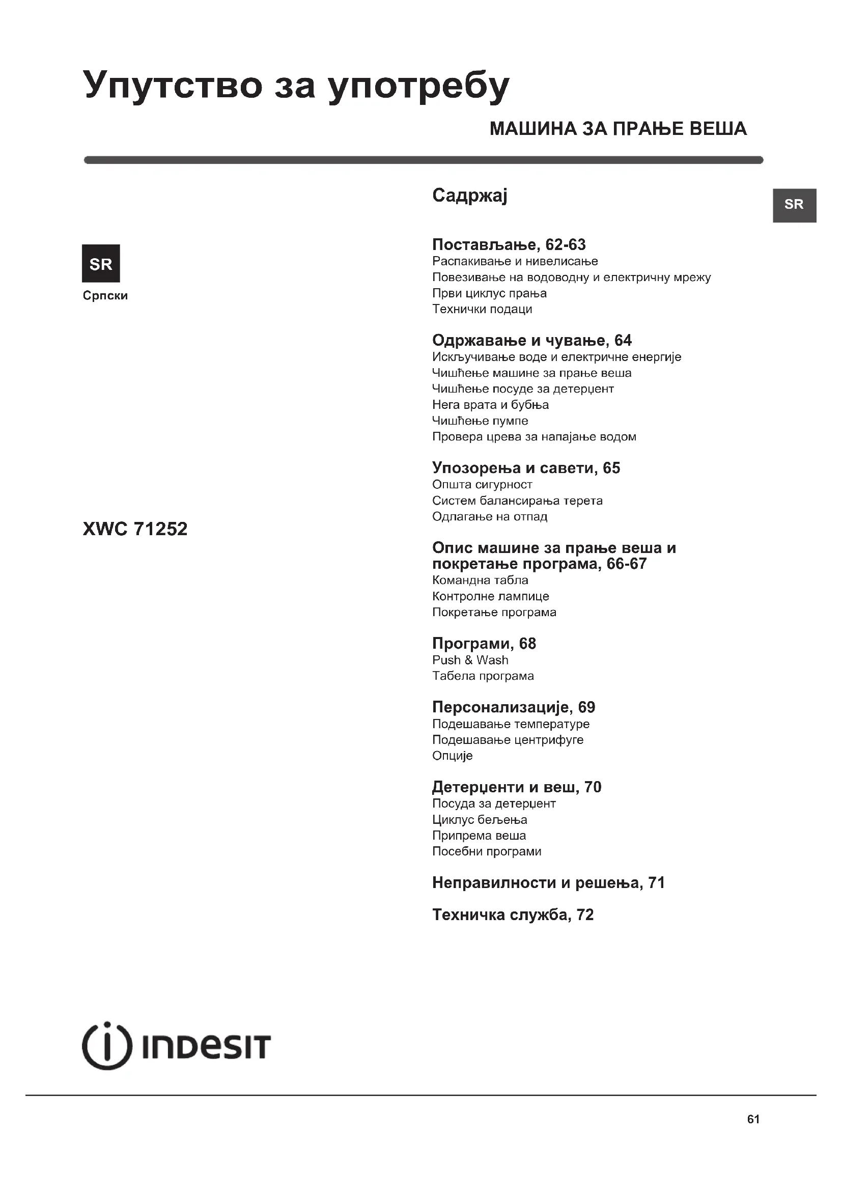 XWC 71252 - Перач машина INDESIT - Besplatni korisnički priručnik