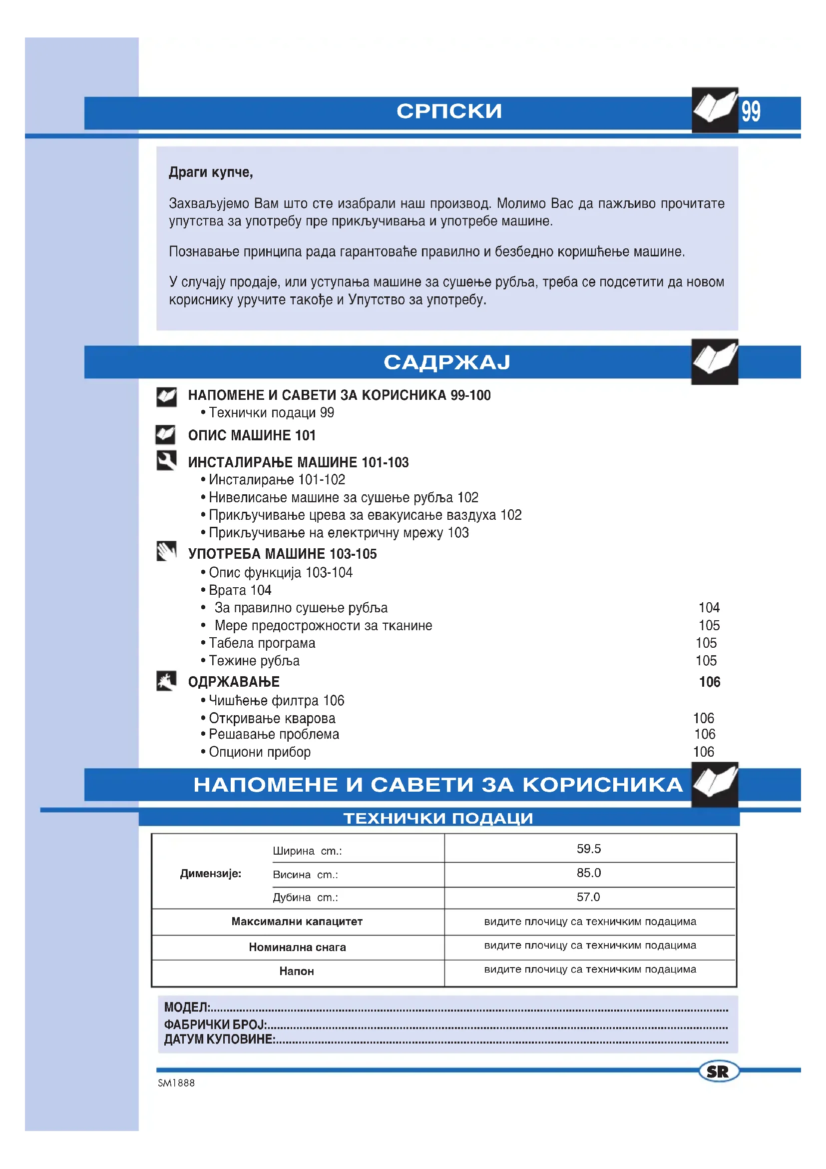видите плочицу са техничким подацимавидите плочицу са техничким подацимавидите плочицу са техничким подацимаМаксимални капацитетНоминална снагаНапон НАПОМЕНЕ И САВЕТИ ЗА КОРИСНИКА 99-100