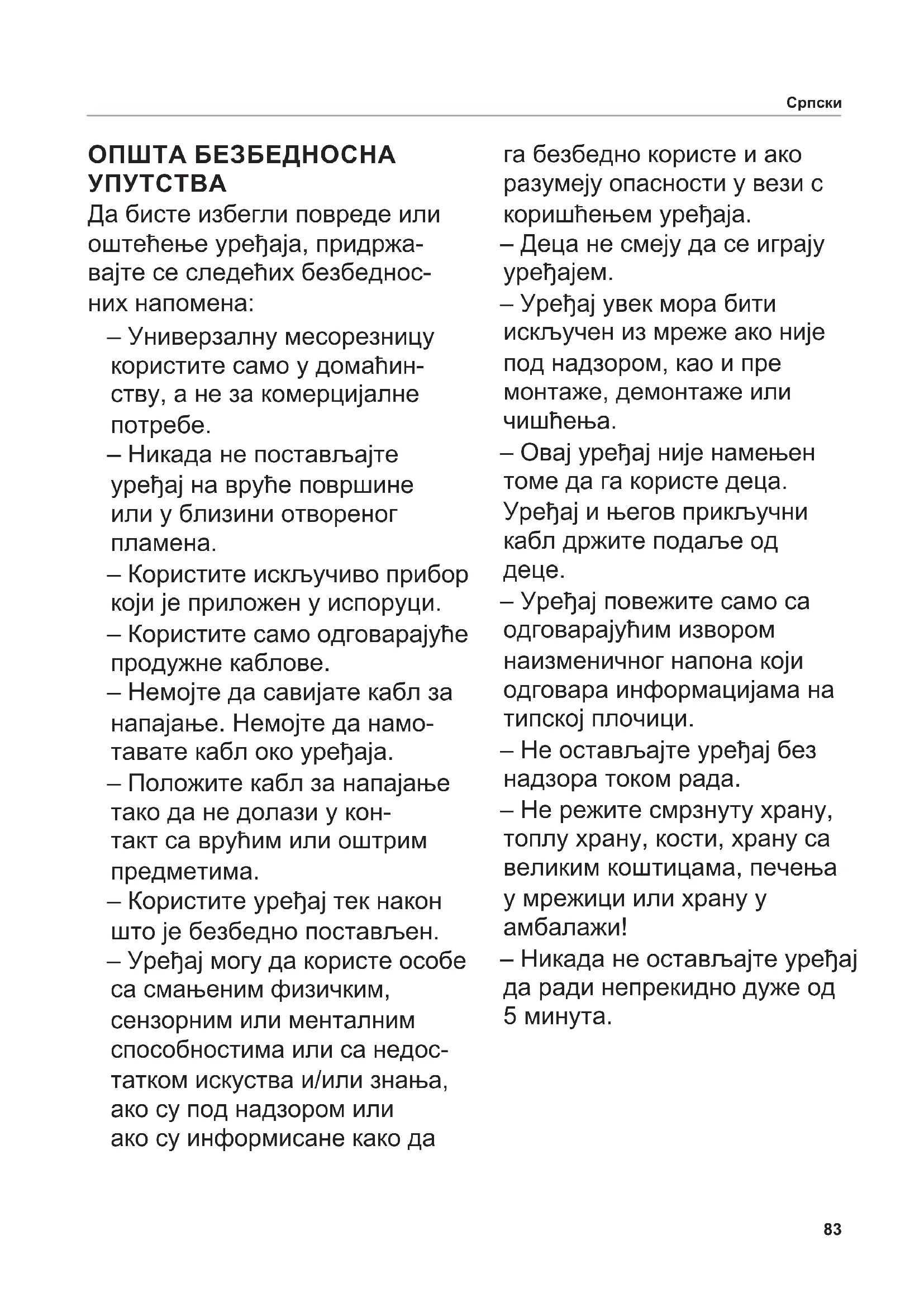 Да бисте избегли повреде или оштећење уређаја, придржа- вајте се следећих безбеднос- них напомена: – Универзалну месорезницу користите само у домаћин- ству, а не за комерцијалне